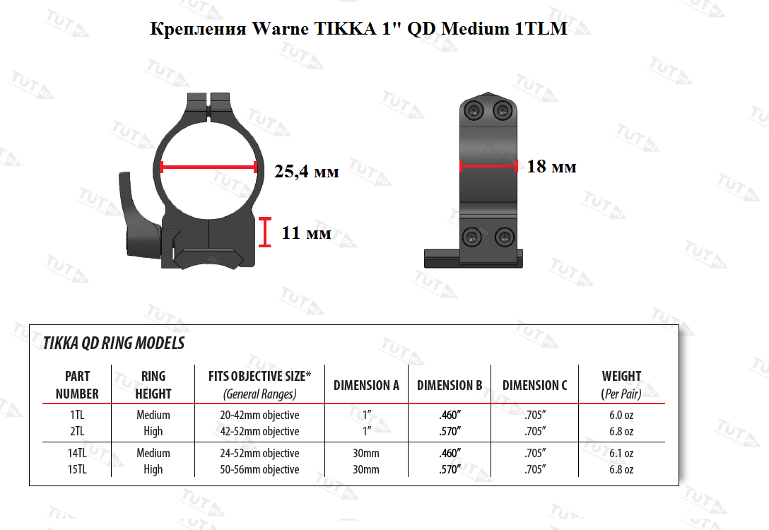 Технические характеристики быстросъемных креплений Warne прицелов 1” для Tikka (1TLM QD)