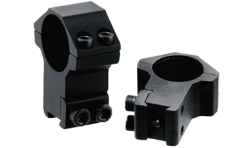 Надежная система фиксации оптики в кольце – 4 винтов (по два с двух сторон) на каждом кольце.