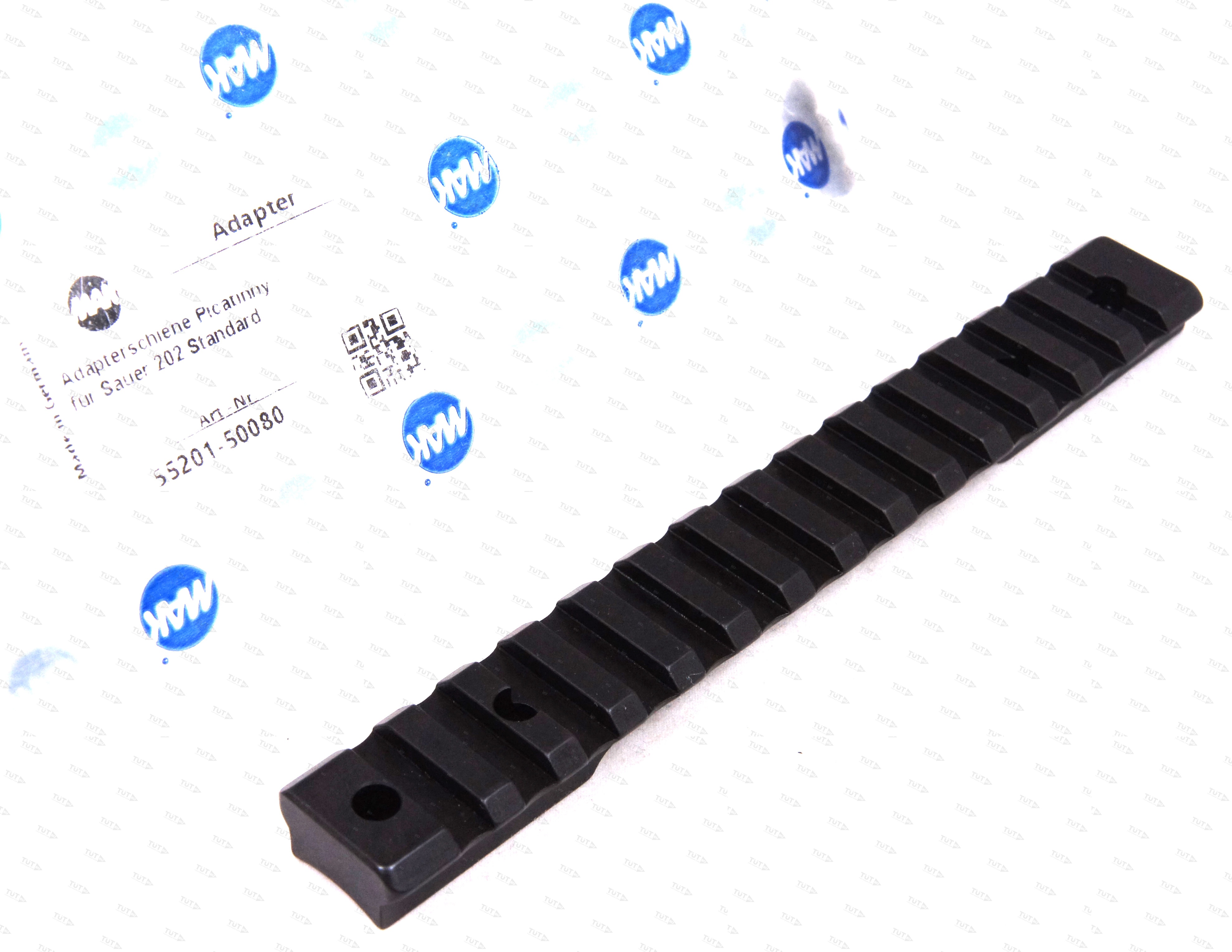 Планка Picatinny/Weaver – единое основание MAK на установки на Sauer 202 Standart. Шина-адаптер с призмой Picatinny/Weaver 21 мм, несъёмная. Планка изготовлена из легированной стали с последующей термообработкой (закалённая сталь). Профиль нижней поверхности основания повторяет профиль поверхности ствольной коробки на Sauer 202 Standart.