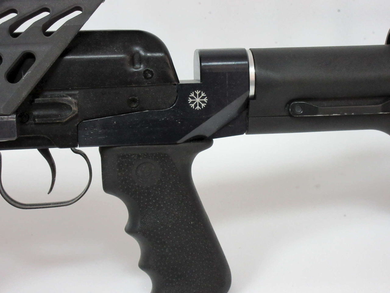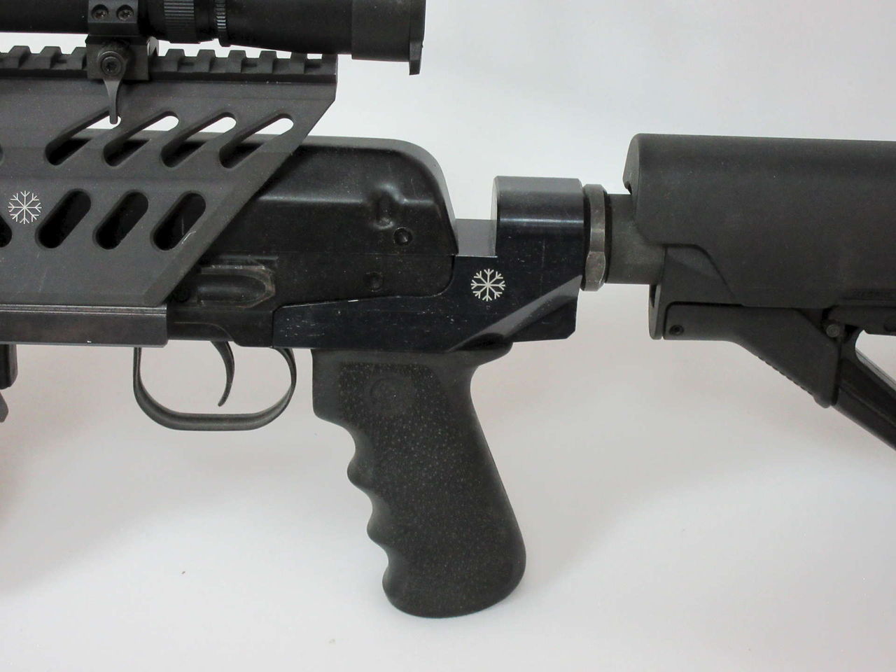 Данный вкладыш позволяет подключать различные телескопические приклады М-серии. Также предусмотрена возможность установки рукояток управления огнём АК-типа в двух положениях: расстояние между отверстиями для крепления рукояток составляет 10 мм.