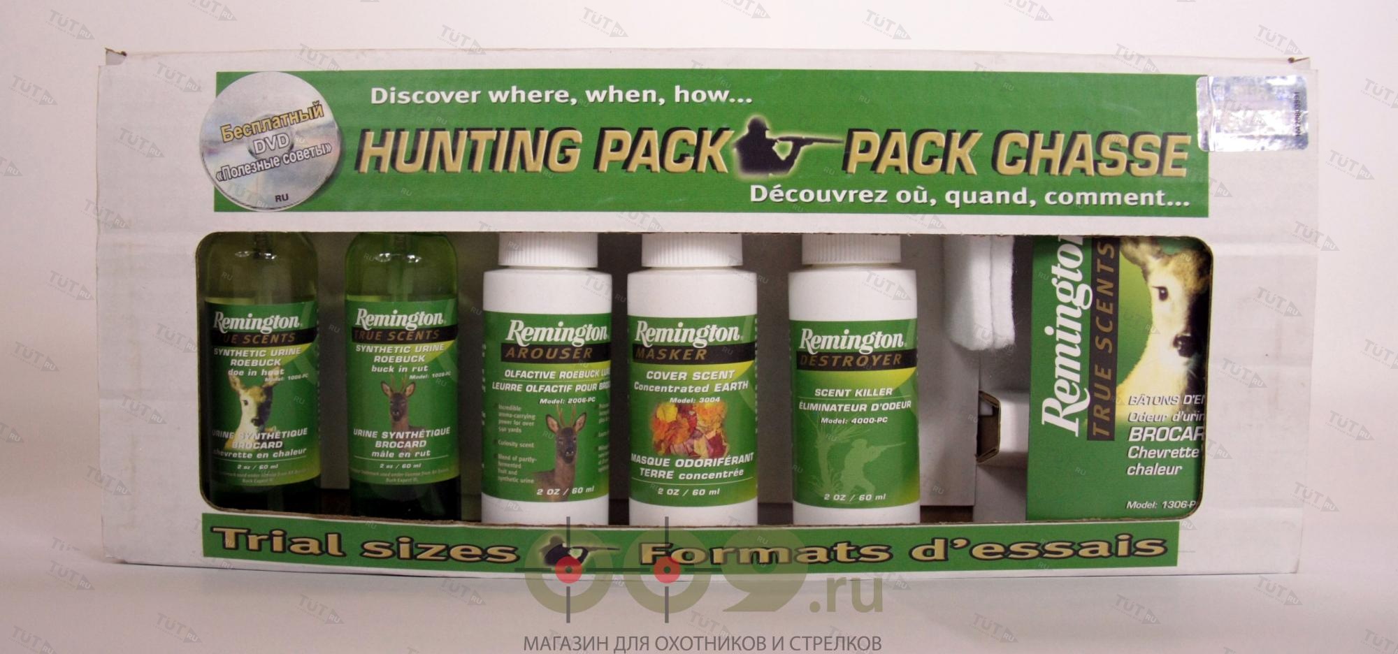 Набор включает в себя: 1009 - спрей, синтетическая урина самка. 2009 - спрей, парфюмерный запах самец. 1011 - спрей, синтетическая урина самец. 4000 - нейтрализатор запаха человека. 3004 - спрей, "запах земли". 1309 - дымящиеся палочки, запах самка. DVD полезные советы. Хранить в недоступном для детей месте. Не подлежит обязательной сертификации. Утилизировать вместе с бытовыми отходами. Производитель: 2350, 95th Street Saint-Georges, Quebec, Canada, G5Y 8J4 Произведено в Канаде.