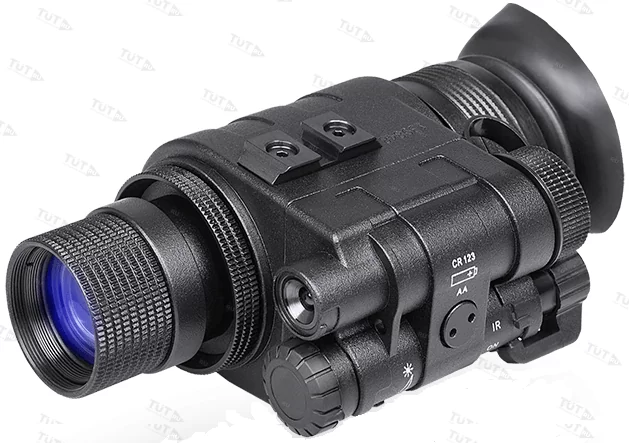 Существует ряд сменных объективов, при помощи которых можно увеличить кратность до 9,6х. Оснащен ИК-осветителем 20 мВт с невидимым пятном свечения, при включении которого дальность видимости увеличивается, индикатором батарей и включения ИК-осветителя.
