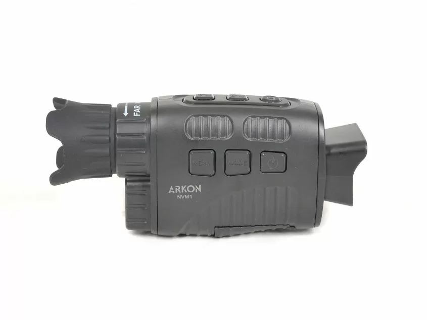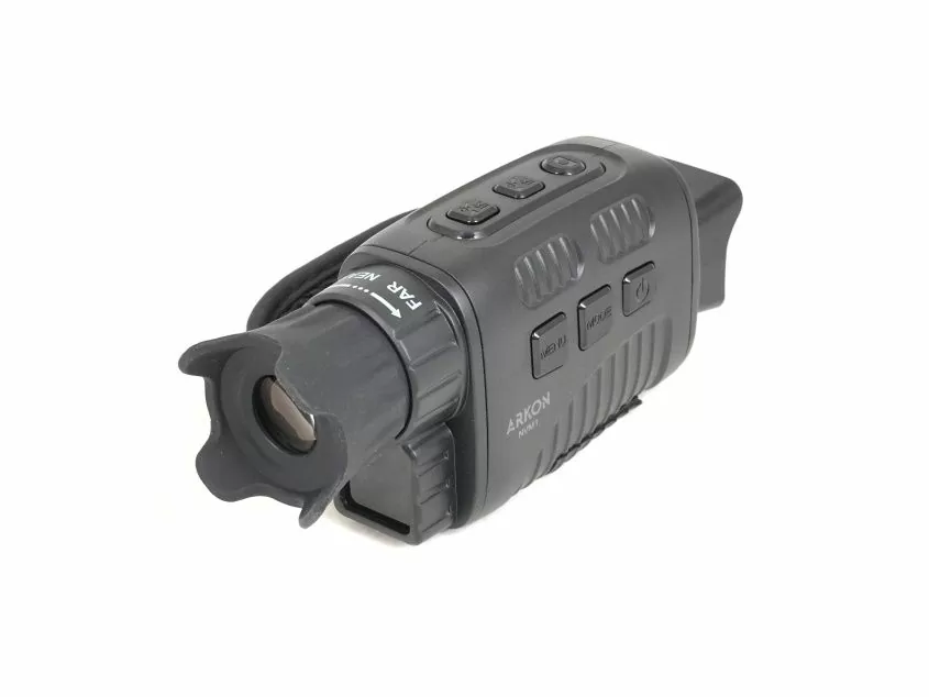 Arkon Lite NVM1 оснащен объективом с фокусным расстоянием 25 мм, светосилой F1.2 и ручной фокусировкой. Базовое оптическое увеличение прибора составляет 1х, что делает изображение естественным и без искажений масштаба. Встроенный цифровой зум доступен в пределах от 1х до 4х, что позволяет рассматривать объекты более детально. Пространственный угол поля зрения FOV (Field ofview) составляет 10°, что соответствует видимой области пространства размером 17,5 м на расстоянии 100 м. Этого достаточно, чтобы уверенно контролировать пространство перед собой и видеть объекты даже в условиях ограниченной видимости. Фокусировка резкости выполняется с помощью кольца на объективе, которое имеет удобную насечку, позволяющую работать даже в перчатках.