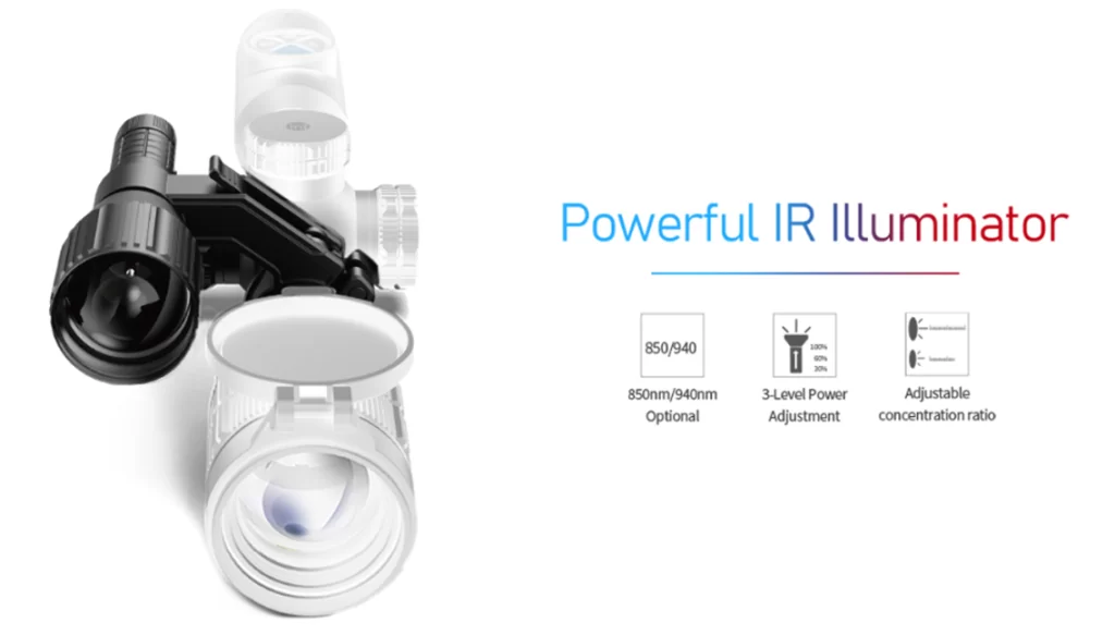 Прицел поставляется с навесным ИК-осветителем, обладающим функцией регулировки мощности и фокусировки светового потока. Устройство работает на длинах волн 850 нм (граница видимой части спектра) или на 940 нм (невидимый спектр), зависит от комплектации. Доступны регулировки мощности в пределах трех уровней. Для применения на близлежащей местности рекомендовано расфокусированное излучение, а для того, чтобы «пробить» темноту на максимальное расстояние, необходимо использовать сфокусированный луч.