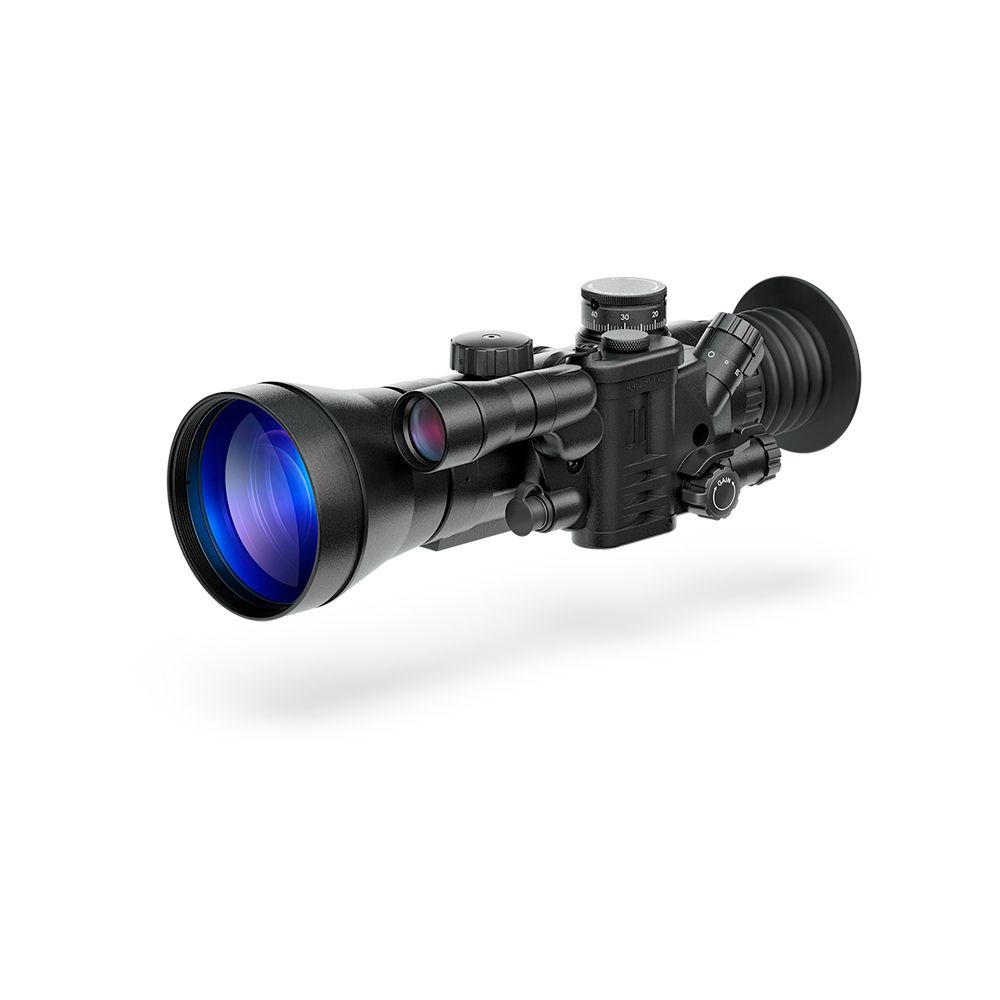 100 миллиметровая апертура пропускает достаточное количество света для регистрации минимального отраженного излучения. Идеальная геометрия линз, обработанных с нулевым допуском, полностью избавила от любого рода оптических искажений. Низко-дисперсные стекла учитывают особенности ЭОП и спектральный состав света при наблюдении в условии с низким уровнем освещенности. Длиннофокусный объектив F100 / f1,5 обладает увеличением 3,7х. Угол поля зрения равен 17,5 х 10 градусов, что в линейном выражении предоставит видимость области пространства 18,7 х 14 метров на удалении в 100 метров. Показатель хорош для обзорных наблюдений на открытых пространствах и сопровождения цели в случае ее движения. Широкоугольная оптика дает возможность вести огонь по движущимся целям, не теряя визуальный контроль над окружающей обстановкой.