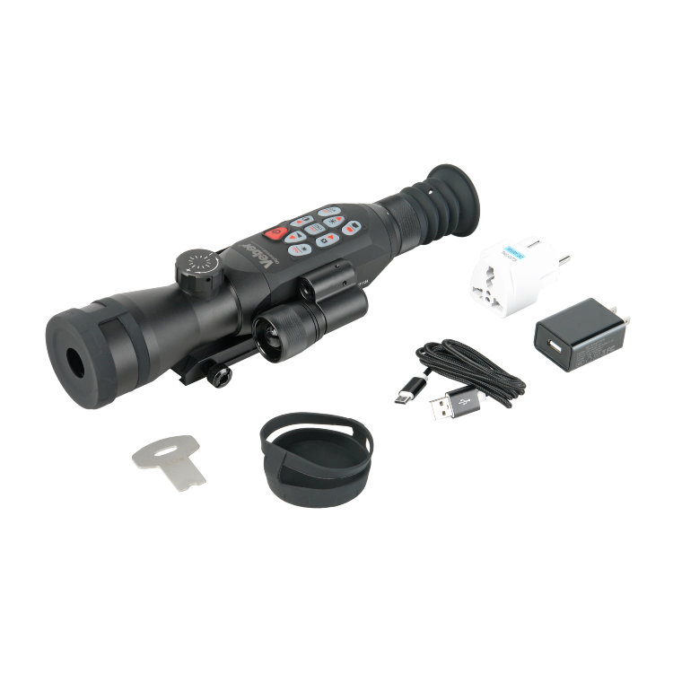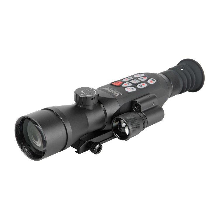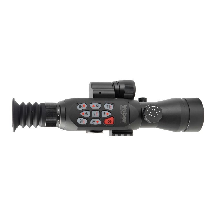 Назначение и применение Цифровой прицел Вебер DigitalHunt R50X4-18 HD Plus (940 нм) с расчётом баллистики предназначен для охоты, страйкбола и стрельбы на ближних и средних дистанциях из огнестрельного оружия с дульной энергией 6-7.000 Дж; подходит для стационарных ночных и дневных наблюдений с дистанционным управлением и видеофиксацией картинки. Основные параметры Встроенный ИК-осветитель 940 нм, дальность действия до 350 м. Увеличение 4.6x...18,4x (прицел) или увеличение 4x (монокуляр). 5 рабочих экранов. Расчёт баллистики, 2 дальномерных шкалы. ЛЦУ, датчик температуры, гироскоп, электронный компас, GPS. Wi-Fi, запись фото/видео (без звука) на съёмную карту до 32 ГБ. 6 ч работы от встроенного аккумулятора. USB-C разъём. Кнопка для сброса настроек, светодиодный индикатор зарядки. Панель управления с «быстрой» подсветкой кнопок. Стойкость к отдаче до 6-7 тыс. Дж. Водонепроницаемость IP65. Один кронштейн для крепления на планку Weaver и на штатив. Особенности конструкции и настройки «Невидимая» ИК-подсветка с дальностью обнаружения до 350 м. Цифровой ночной прицел Veber DigitalHunt R50X4-18 HD Plus оснащён матрицей 1920х1080 и цветным дисплеем LCOS 1280х720 (50 / 60 Гц), отличается хорошим откликом, адекватной работой при -10°С и плавной, без зависания, картинкой при просмотре динамических сцен. Можно наблюдать за неподвижным и набегающим зверем, мониторить окрестности в режиме реального времени и получать чёткое изображение даже при резком смещении прибора. При низкой освещённости и в темноте используется встроенный ИК-фонарь 940 нм, с помощью которой лося или оленя удастся обнаружить на расстоянии до 350 метров от охотника. У осветителя три уровня мощности, а его луч полностью невидим как для человеческого глаза, так и для приборов ночного видения. Большой набор встроенных функций. ЛЦУ ночью работает как лазерная указка и помогает подсветить цель на коротких дистанциях. Термодатчик измеряет температуру окружающей среды. Гироскоп позволяет визуально контролировать угол наклона и бокового завала прицела с ружьём. Электронный компас используется для определения направления по сторонам света, а GPS – для вычисления текущих координат и позиционирования. Часть данных используется при расчёте баллистики и автоматически вносится в таблицу. Расчёт баллистики, 2 дальномерных шкалы и режим «монокуляр». Прибор работает и как прицел с увеличением 4,6x...18,4x, и как ночной монокуляр с неизменяемым увеличением 4x. Оригинальная особенность прицела — неклассическая система пристрелки и выверки. Вместо набора сеток и профилей — 5 рабочих экранов, циклично сменяющих друг друга кратким нажатием кнопки. I экран используется для стрельбы и быстрой оценки расстояния до целей высотой 0,5 м и 1,5 м, II экран — для работы в режиме монокуляра, III и V — для прицельной стрельбы на коротких и средних дистанциях, а IV — для баллистических расчётов. Баллистический профиль один, заполняется вручную, кроме показаний встроенного термодатчика и GPS — они вносятся автоматически. Расстояние вносится вручную либо по показаниям дальномерной шкалы с I экрана, либо по показаниям внешнего дальномера (не входит в комплектацию). И всё автоматически сохраняется и учитывается в текущем баллистическом расчёте. Запись видео и интеграция со смартфоном. Наличие Wi-Fi позволяет подключить Вебер DigitalHunt R50X4-18 HD Plus к планшету или смартфону, на котором заранее 