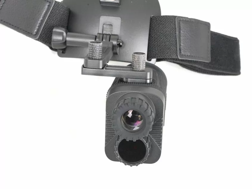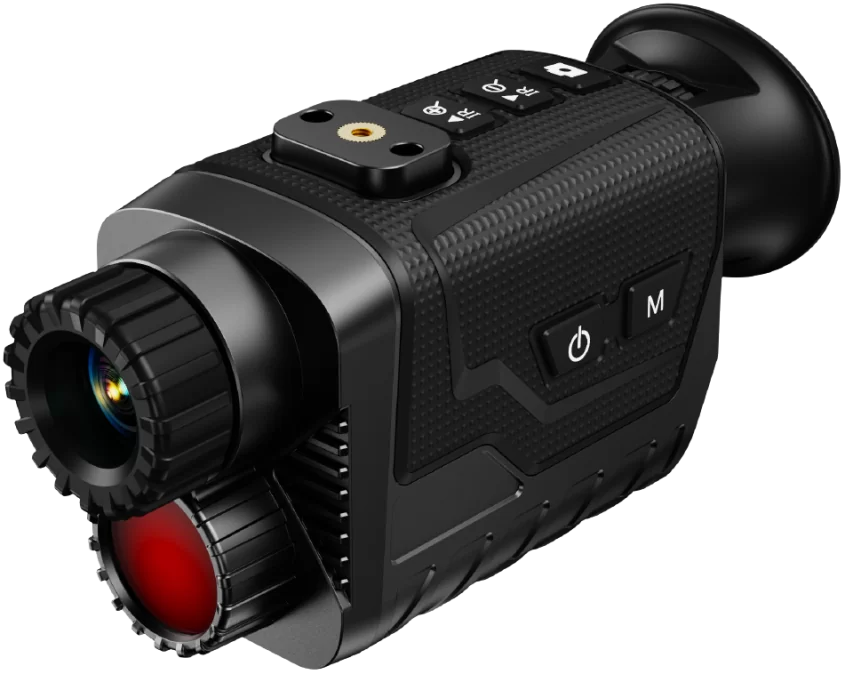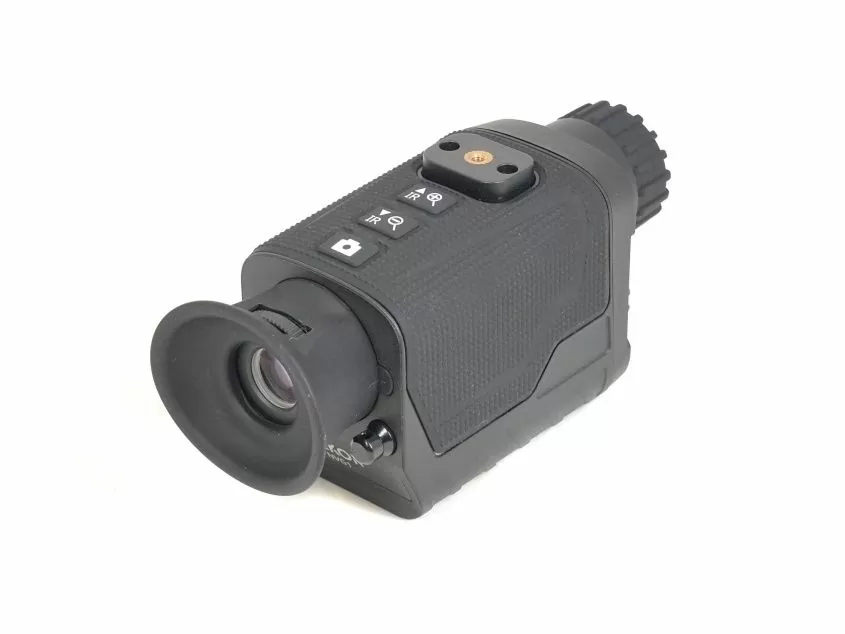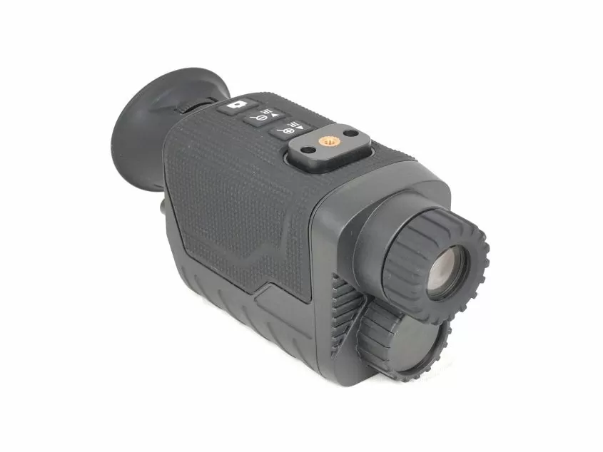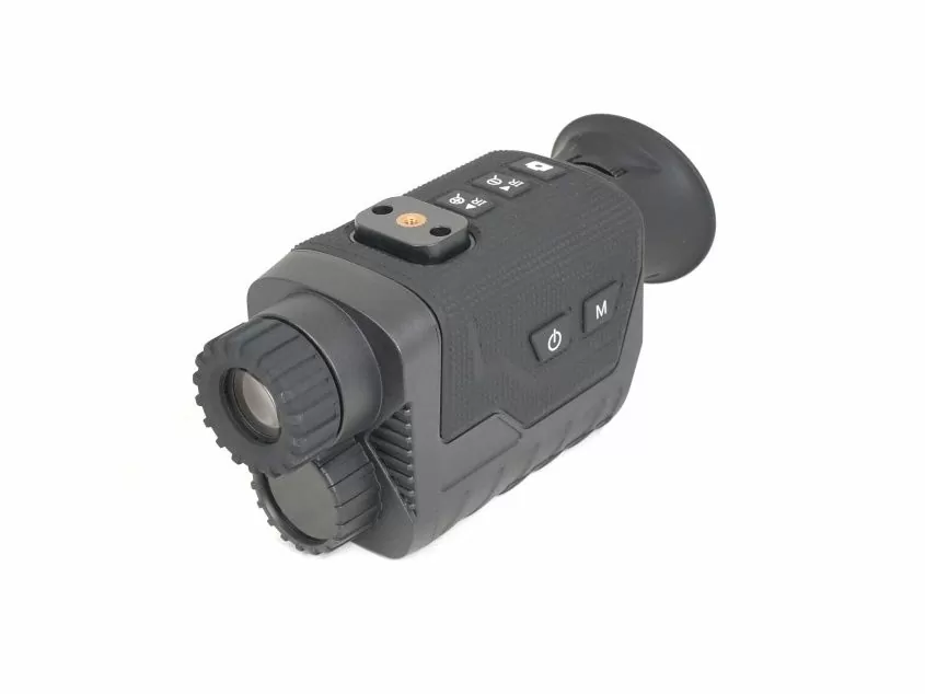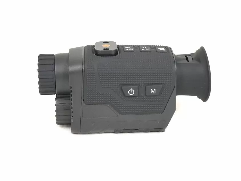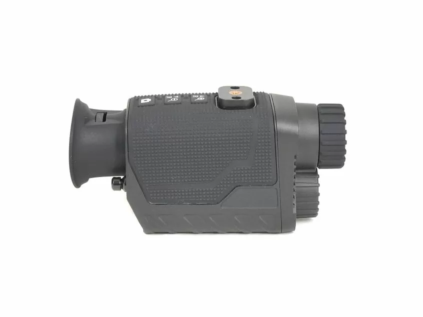 Объектив монокуляра имеет фокусное расстояние 25 мм и светосилу F1.2. Это сочетание позволяет получать ясное изображение даже при слабом внешнем освещении. Оптическое увеличение составляет 1х, что сохраняет естественные размеры объектов и облегчает ориентирование на местности. Цифровой зум доступен в диапазоне от 1х до 8х и открывает возможность рассматривать удаленные объекты с высокой степенью приближения. Пространственный угол поля зрения FOV равен 10°, что соответствует видимому участку пространства размером 17,5 м на дистанции 100 м. Для индивидуальной подстройки изображения под особенности зрения прибор оснащен механизмом диоптрийной корректировки. Механизм фокусировки находится на объективе, низкопрофильное кольцо с насечкой позволит манипулировать тонкими настройками даже в перчатках.