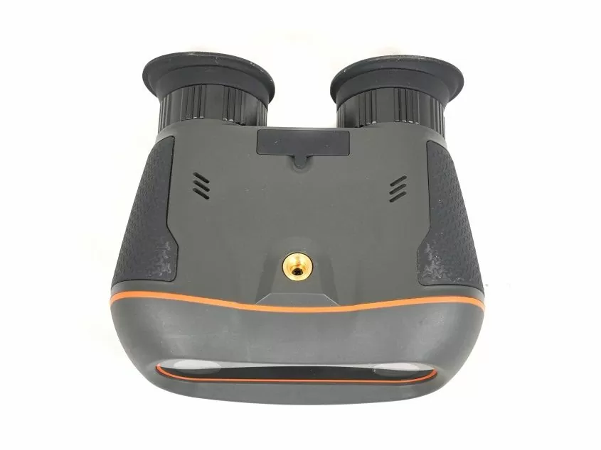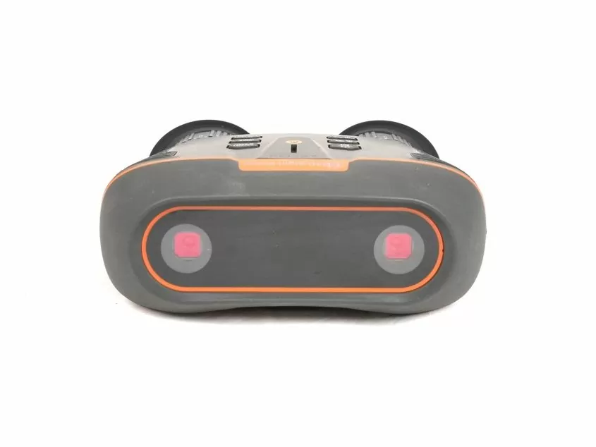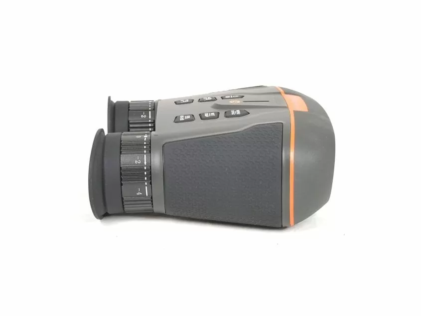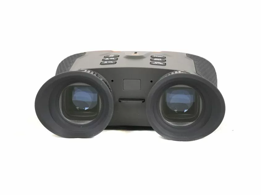 Прибор оснащен двумя объективами с фокусным расстоянием 5,58 мм и светосилой F1.2. Пространственный угол поля зрения FOV (Field of view)58° позволяет охватывать широкую область пространства размером 110 метров на удалении 100м. Встроенный цифровой зум до 12х дает возможность приближать изображение любого удаленного объекта и рассматривать его в мельчайших подробностях. В меню доступна регулировка экспозиции, ISO и других параметров, что позволяет адаптировать изображение под различные условия освещения. Для удобства предусмотрены кольца диоптрийной настройки каждого окуляра и функции синхронизации дисплеев, позволяющие настроить картинку под индивидуальные особенности зрения.