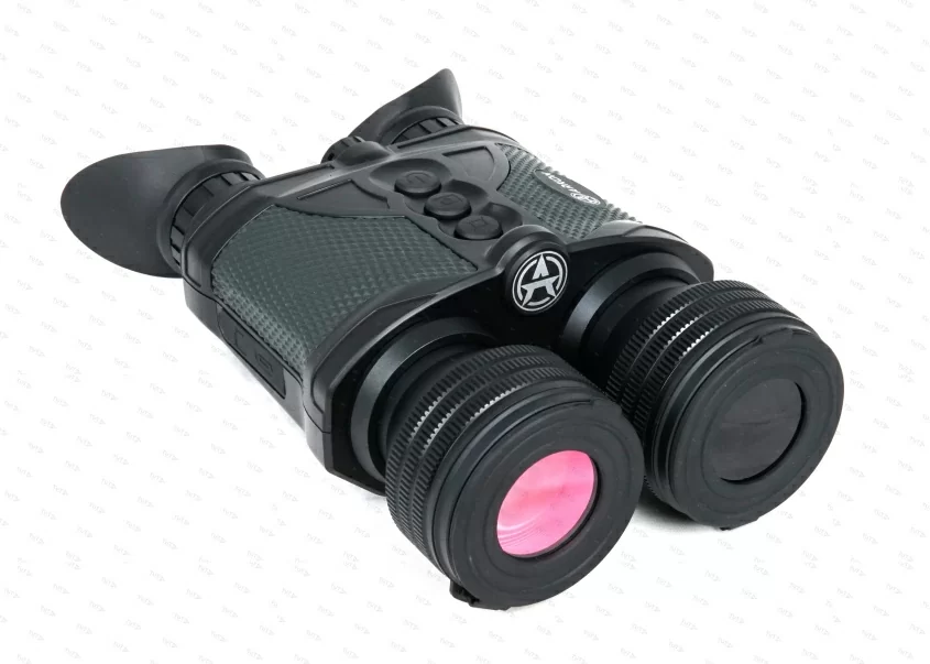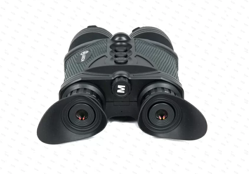 Все управление биноклем и навигация по меню осуществляется при помощи энкодера, который расположен между окулярами. Также на корпусе имеются три кнопки с выпуклым теснением и понятными пиктограммами. Сам корпус изготовлен из сверхпрочного полиамида, покрыт резиновыми вставками, помогающими прочно удерживать оптику даже полностью мокрыми руками. Пользоваться биноклем можно в условии повышенной влажности, запрещается прямое попадание под струи воды. Класс защиты от влаги IP65. Также следует отметить, что при весе прибора в 800 грамм, предусмотрена возможность проведения наблюдений из стационарного положения. Резьбовой адаптер ¼ дюйма имеется в нижней части корпуса.
