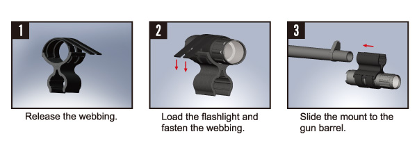 Кронштейн изготовлен в виде клипсы для крепления на ствол и имеет два ремешка - липучки для установки фонаря.
