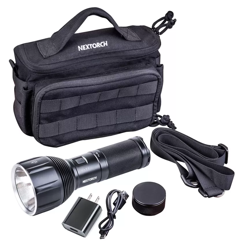 Материал корпуса: авиационный алюминий 6061-T6, анодированный по типу III (армейский стандарт)', 'Источник света: белый светодиод CREE® XHP70B', 'Световой поток: 3500 люменов / 1850 люменов / 500 люменов / 65 люменов', 'Длина луча: до 600 метров', 'Четыре яркости свечения: турбо, яркий, средний, тусклый', 'Четыре режима работы: включение без фиксации, стандартное свечение, стробоскоп, сигнал бедствия', 'Индикатор уровня заряда (4 уровня)', 'Питание: 4 литий-ионных аккумулятора NEXTORCH 4 (2600mAh, 14.4v)', 'Работа от 1 комплекта питания: от 3 часов до 110 часов', 'Габариты: длина — 21.2см, диаметр корпуса — 5см, диаметр головы — 8.3см', 'Масса: 790гр с учетом встроенной батареи', 'Защищенность: IPX7 (падение с высоты 1 метра, влагостойкость)', 'Быстрая зарядка через USB-C', 'Режим батареи для мобильных устройств', 'Кассета для таблеток и других мелочей и съемный батарейный отсек', 'В комплект входят: нейлоновая сумка для транспортировки, дополненная съемным делителем пространства и внешней панелью MOLLE, зарядное устройство, кабель USB-C, ремень для переноски на плече'