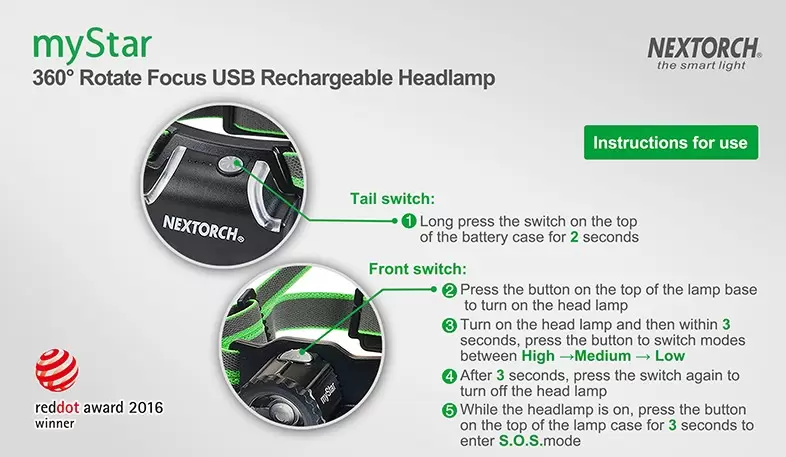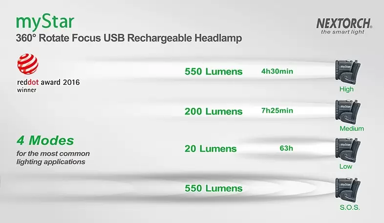 Фонарь Nextorch myStar V2.0 налобный, 760 люмен, фокусировка луча