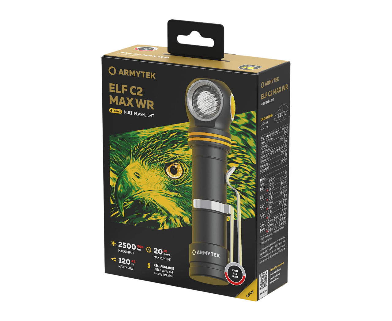Все товары серииElf C2 Max WR — универсальный фонарь с красным и белым светом мощностью до 2500 люмен. Широкий луч подходит для работы вблизи и подсветки больших пространств. Красный свет (200 люмен) сохраняет ночное зрение, эффективен в тумане и не привлекает насекомых — идеален для охоты, рыбалки, туризма и навигации по картам. Может использоваться как велогабарит.