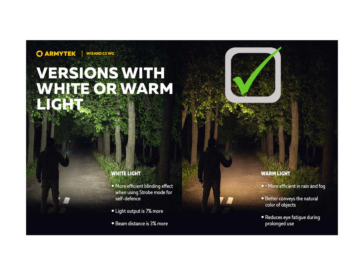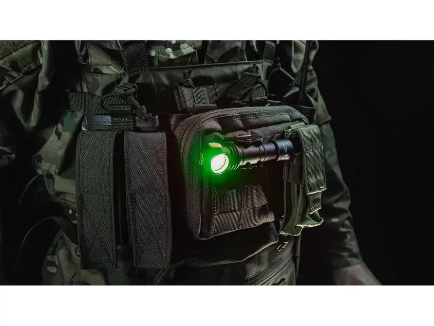 Как и красный, зеленый световой поток эффективен во время тумана и в других условиях затрудненной видимости, комфортен для продолжительного использования. Однако зеленый свет обладает важным преимуществом: обеспечивает большую четкость линий и детализацию объектов, позволяет различать цвета. Он практически незаметен со стороны, а также не воспринимается как угроза животными и птицами, что особенно полезно на охоте или для наблюдения за дикой природой. Использование Wizard C2 WG в режимах зеленого света не привлекает назойливых насекомых.