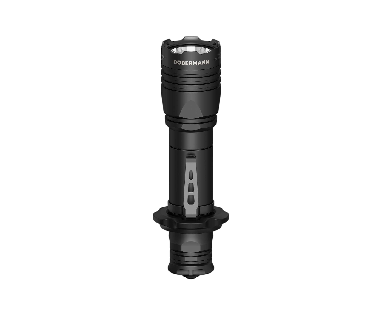 Dobermann функционирует как от стандартного аккумулятора 18650 Li-Ion, так и от двух литиевых батареек CR123A. Возможность выбора источника питания позволяет адаптировать автономность под конкретные задачи. Как и ранее, аккумулятор и зарядное устройство приобретаются отдельно. Модель сохранила совместимость с оригинальной выносной кнопкой, а также со штатными и универсальными креплениями для установки на оружие.