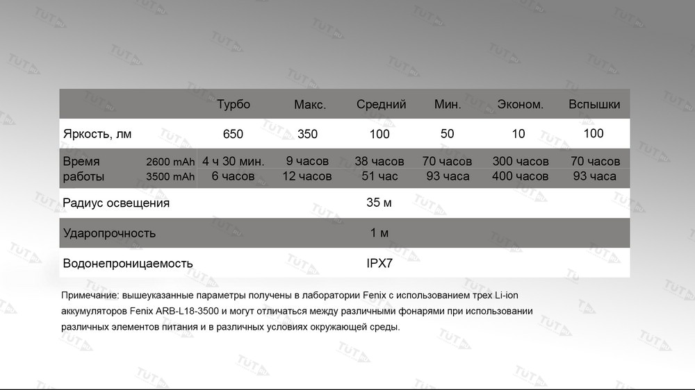 Для работы фонаря CL30R потребуются аккумуляторы размера 18650. Полный набор включает три элемента питания, но если окажется необходимым, данная модель в состоянии работать и на одном или двух аккумуляторах. В этом случае длительность работы фонаря уменьшится. Производители также привели данные о времени автономной работы CL30R при использовании фирменных аккумуляторов на 2600 мАч и на 3400 мАч. Для режима Turbo это 4 с половиной и 6 часов, для режима High — 9 и 12 часов, для режима Mid — 38 и 51 час, для режимов Low и Flash — 70 и 93 часа, для режима Eco — 300 и 400 часов. Таким образом, емкость и качество элементов питания напрямую влияет на период автономной работы кемпингового фонаря.