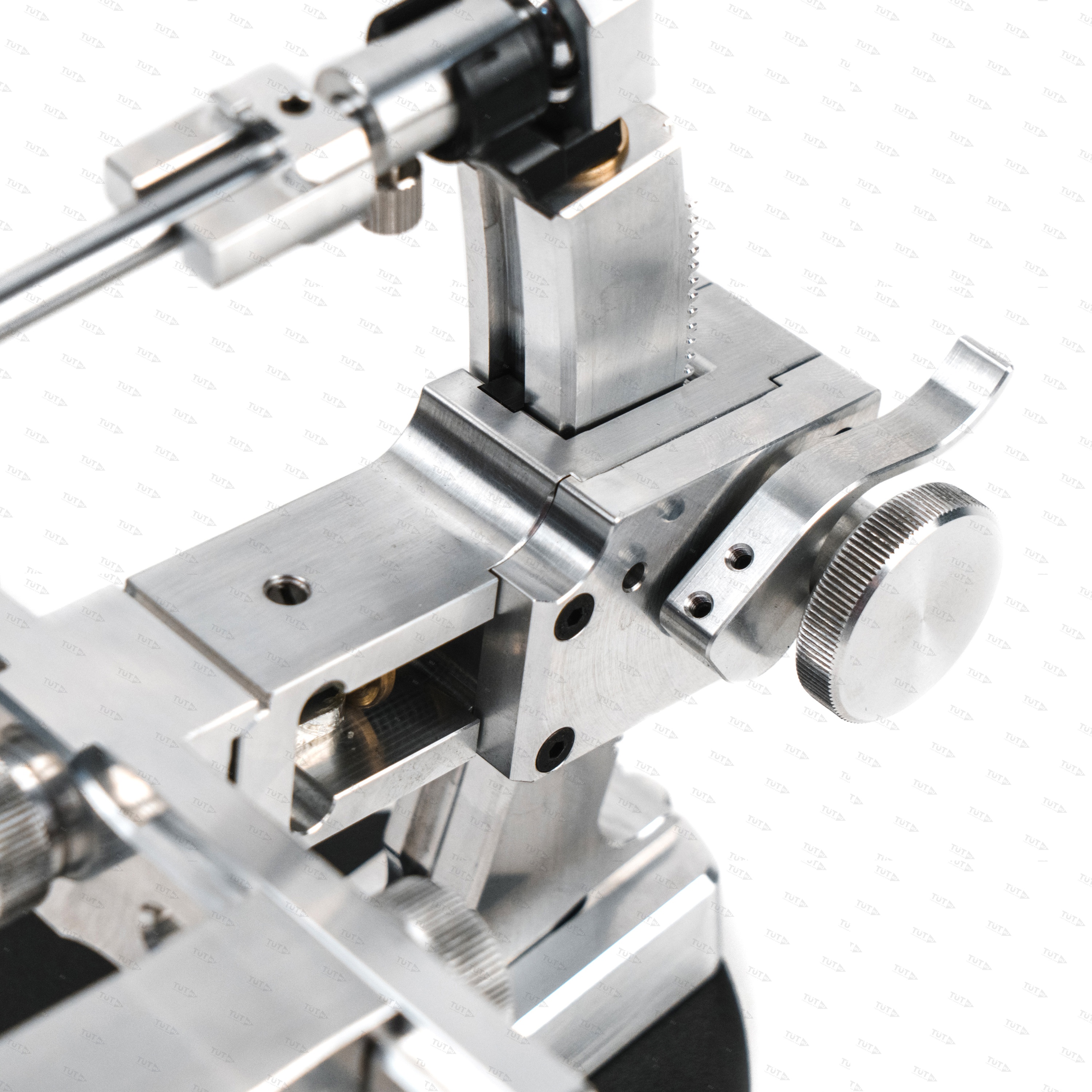 Поворотный механизм точилки TSPROF Kadet Pro, версия Т, помогает сохранить одинаковый угол заточки на обеих сторонах ножа. После переворота рычаг намертво фиксирует рамку с зажимами. Вращением ручки подъема, поворотный узел плавно движется вокруг виртуального центра, в котором находится режущая кромка ножа. Дуговая стойка изготовлена из единого куска алюминия и интегрирована с реечным подъемником с зубчатым зацеплением. Стопорный рычаг, после настройки необходимого угла, позволяет надежно зафиксировать крепление поворотного узла.
