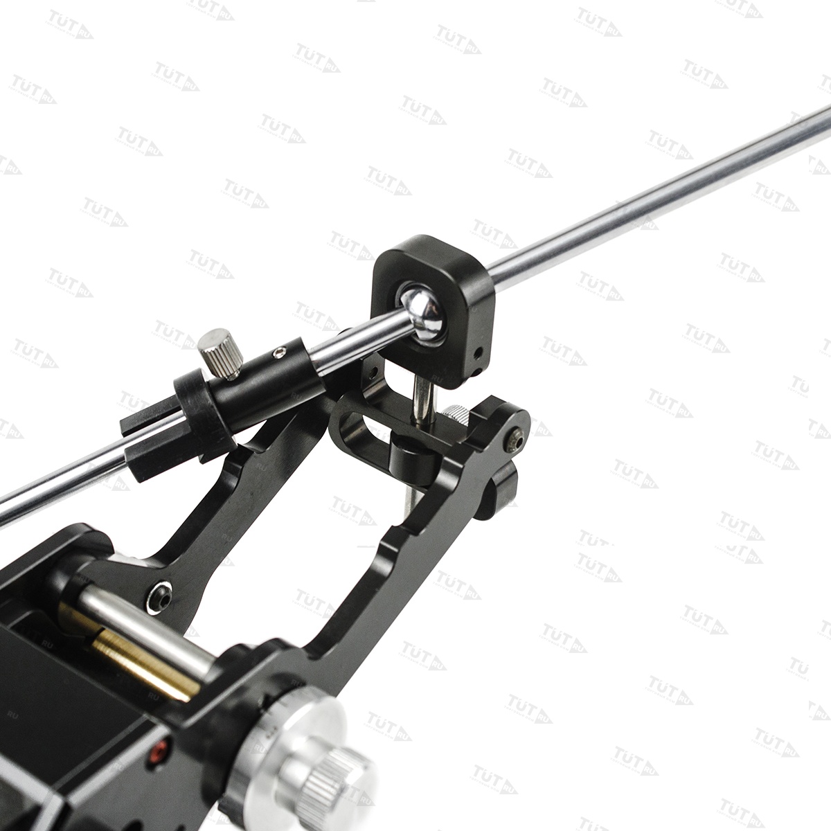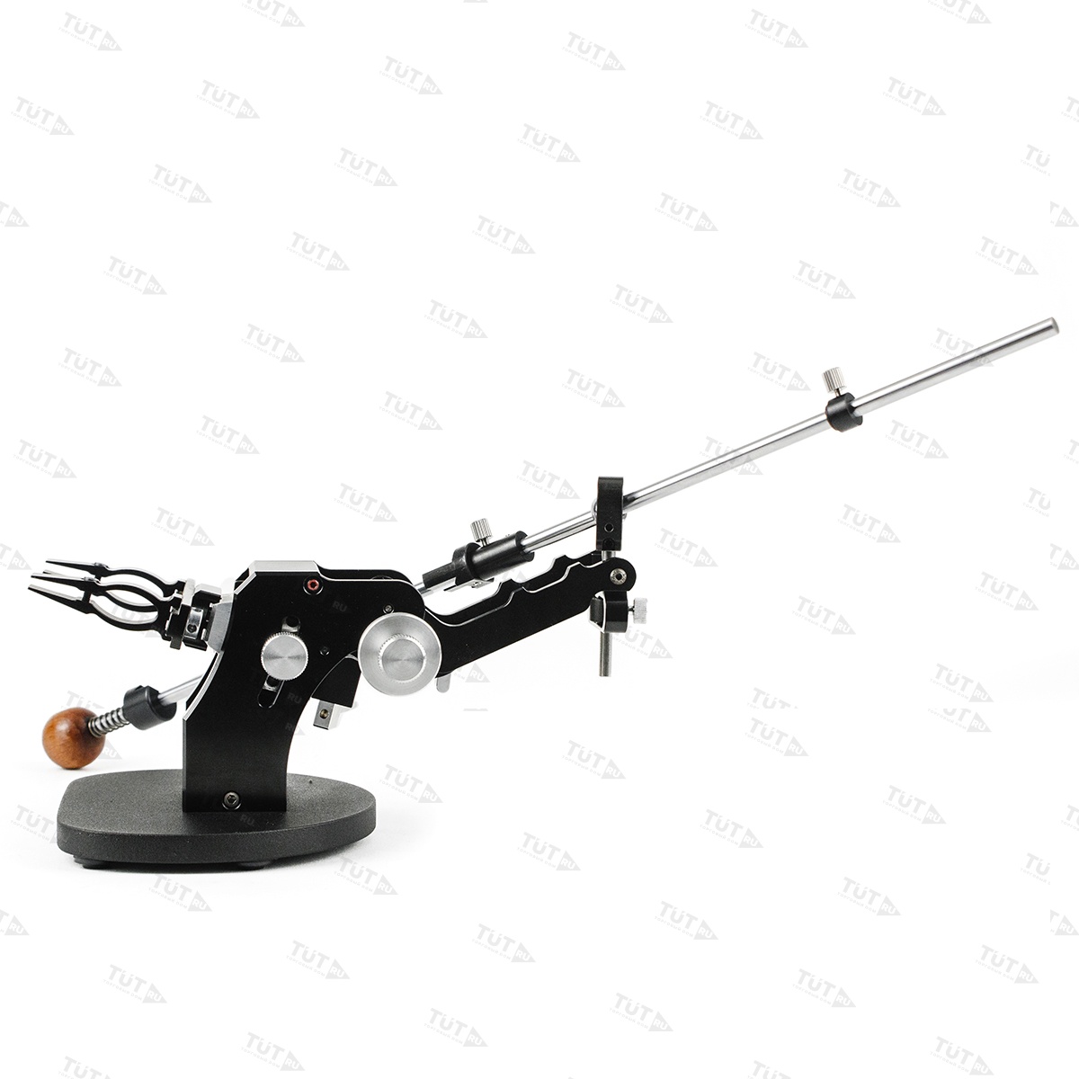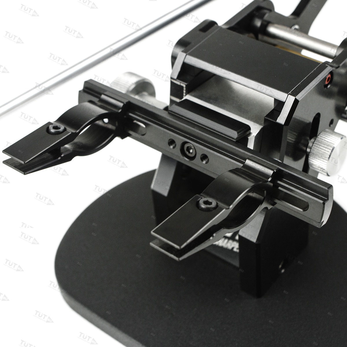 Штанга держателя абразива выполнена из стали, а упоры держателя, соединительная муфта и ограничитель из алюминия с анодированием черного цвета. Штанга позволяет фиксировать абразивы на бланках, длиной до 150 мм.