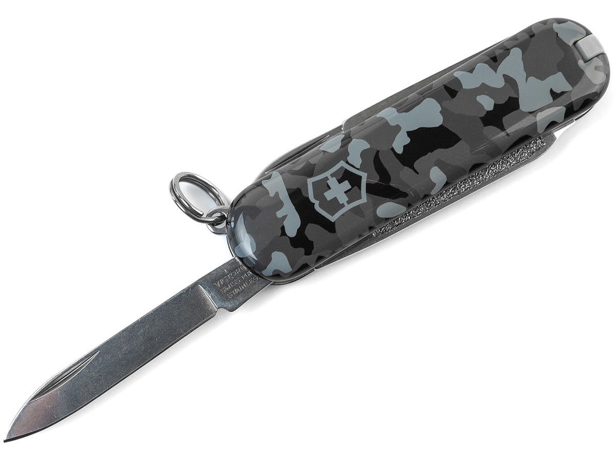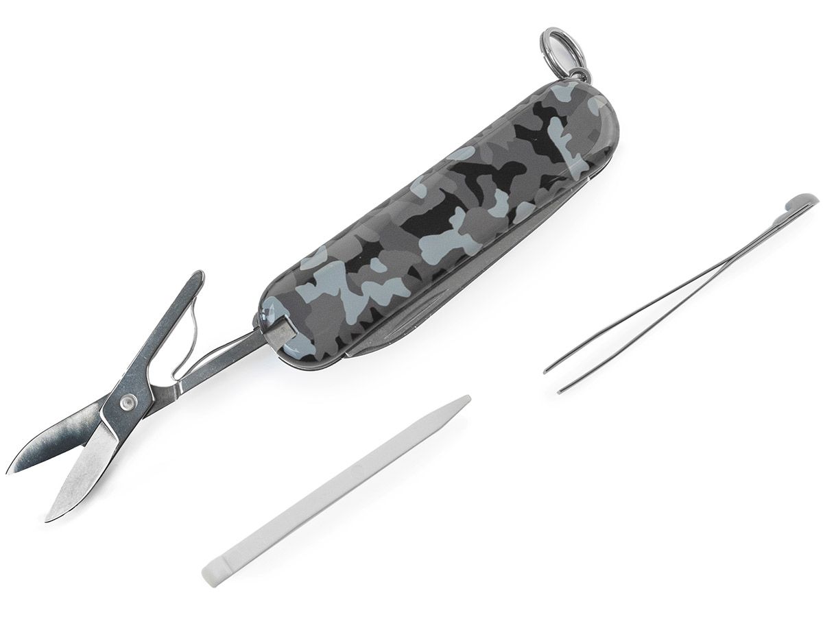 Нож Victorinox Classic SD Printed Navy camouflageМиниатюрный нож-брелок Classic SD в цвете Printed Navy camouflage длиной всего 58мм несмотря на миниатюрные размеры может оказаться очень полезным и включает 7 предметов:непосредственно ножпилка для ногтейотвёртка под плоский шлиц 2,5ммножницыпинцетзубочисткакольцо для ношения на ключахКлассический дизайн офицерских ножей Victorinox в виде брелока – отличный подарок и функциональный предмет на каждый день.Комплектуется миниатюрным чехлом для ношения, предотвращающим появление царапин и сколов.Технические характеристики ножа Victorinox Classic SD Printed Navy camouflageОбщая длина: 58ммВысота: 9ммШирина: 18ммДлина клинка: 40ммФиксация предметов: пружина (без замка)Масса: 21г