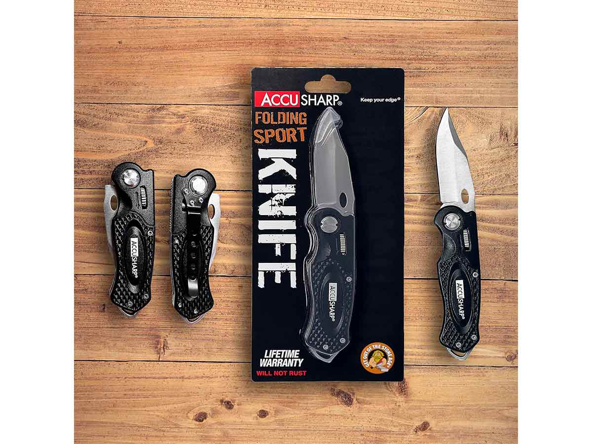 Нож складной AccuSharp Folding Sport Knife, нержавеющая сталь 420, алюминий, чёрныйAccuSharp Folding Sport Knife это небольшой и удобный складной нож, предназначенный для ежедневного ношения, а также походов, охоты и аварийно-спасательных работ.Клинок изготовлен из нержавеющей стали 420. Это отличный материал для производства клинков, отличающийся высокой износостойкостью, прочностью, твёрдостью и долго держащий заточку. Финишная обработка клинка - поперечный сатин позволяет избежать мелких царапин и долго сохраняет привлекательный внешний вид. Спуски от середины клинка обеспечивают отличный рез.Для удобства открытия ножа на клинке расположено овальное отверстие. В ноже установлен инновационный замок - Wheel Lock, который не только надёжно удерживает клинок в открытом состоянии, но и не позволяет ножу случайно раскрыться в кармане.Рукоять чёрного цвета выполнена из прочного анодированного алюминиевого сплава. Нож имеет отверстие для темляка, стеклобой и упругую непереставляемую клипсу чёрного цвета для ношения на кармане или крепления на снаряжении.Характеристики:Материал клинка: нержавеющая сталь 420Материал рукояти: алюминиевый сплавЦвет рукояти: чёрныйДлина клинка: 70ммТолщина обуха: 2,9ммДлина в сложенном состоянии: 108ммДлина в разложенном состоянии: 178ммМасса: 133г