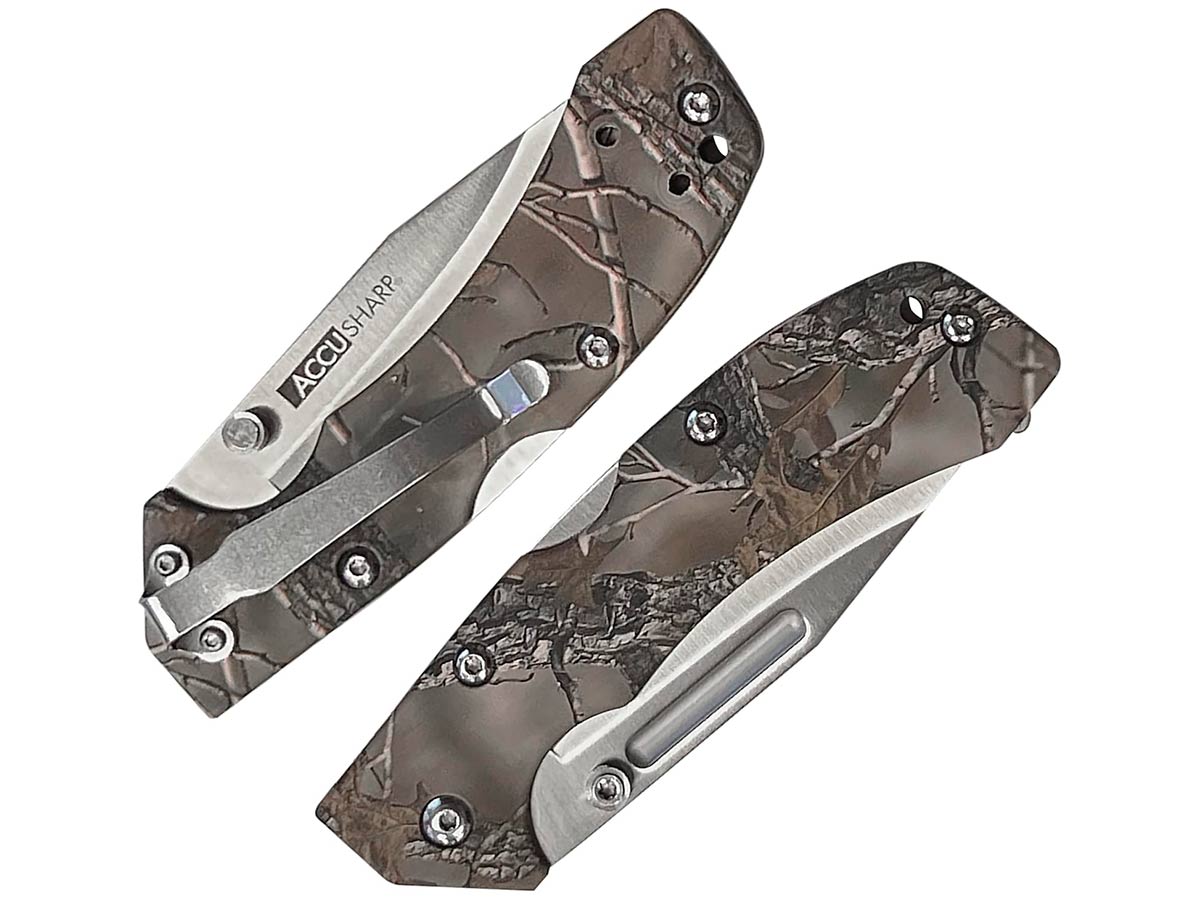 Нож складной AccuSharp Lockback Knife, нержавеющая сталь 420ss, пластик, камуфляжAccuSharp Lockback Knife это небольшой и удобный складной нож, предназначенный для ежедневного ношения.Клинок изготовлен из нержавеющей стали 420ss. Это отличный материал для производства клинков, отличающийся высокой износостойкостью, прочностью, твёрдостью и долго держащий заточку. Финишная обработка клинка - поперечный сатин позволяет избежать мелких царапин и долго сохраняет привлекательный внешний вид. Высокие спуски обеспечивают отличный рез.Нож удобно открывать одной рукой, для этого на клинке расположен цилиндрический двухсторонний шпенёк. При необходимости шпенёк легко можно демонтировать. В ноже установлен классический, один из самых надёжных замков для складных ножей - Back Lock.Рукоять цвета лесной камуфляж выполнена из прочного пластика. Нож имеет отверстие для темляка и упругую непереставляемую клипсу стального цвета для ношения на кармане или крепления на снаряжении.Характеристики:Материал клинка: сталь 420ssМатериал рукояти: пластикЦвет рукояти: камуфляжДлина клинка: 87ммТолщина обуха: 2,8ммДлина в сложенном состоянии: 113ммДлина в разложенном состоянии: 200ммМасса: 76г