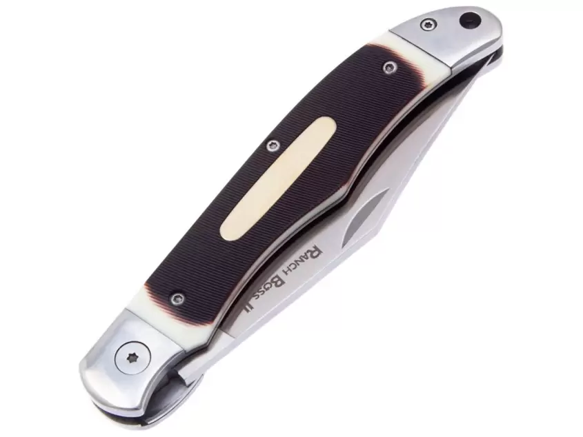 Нож складной Cold Steel Ranch Boss II, SK-5, PVC "искусственная кость"Джентльменский складной нож Cold Steel Ranch Boss 2 — современный нож в мировых традициях. Классический стиль, двуручное открывание с помощью зацепа на клинке, накладки на стальную рукоять сделаны из PVC (поливинилхлорид) и стилизованы под кость.Клинок выполнен из японской инструментальной высокоуглеродистой стали SK-5 High Carbon. Она достойно держит заточку и хорошо зарекомендовала себя на мировом уровне. По габаритам нож немаленький, подойдёт для любителей больших складней: длина клинка более 10 см. Высокие спуски обеспечат отличный рез.Характеристики Cold Steel Ranch Boss II:Длина общая: 235 ммДлина клинка: 102 ммТолщина клинка: 3,5 ммСталь клинка: SK5Материал рукояти: PVC (поливинилхлорид, стилизованный под кость, Faux Sawed Bone)Масса: 147г