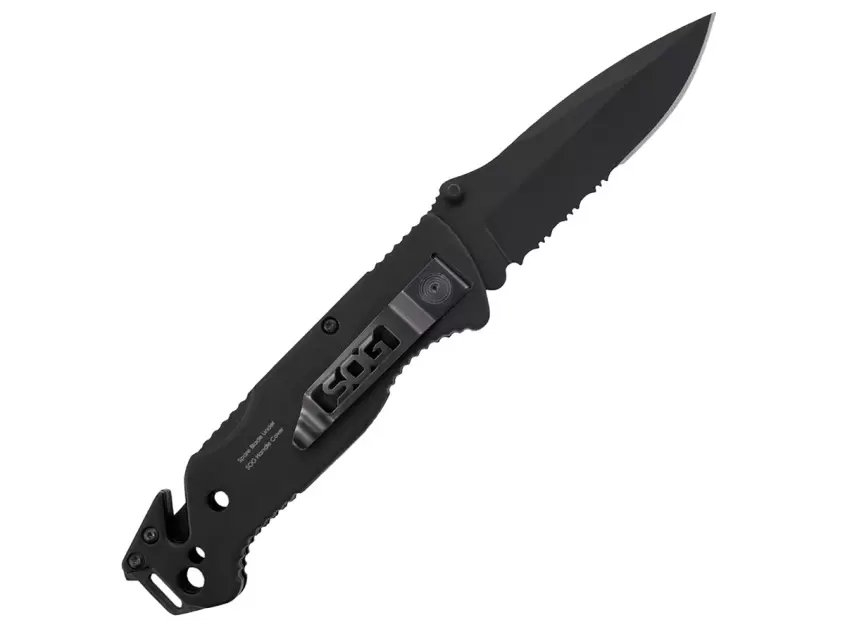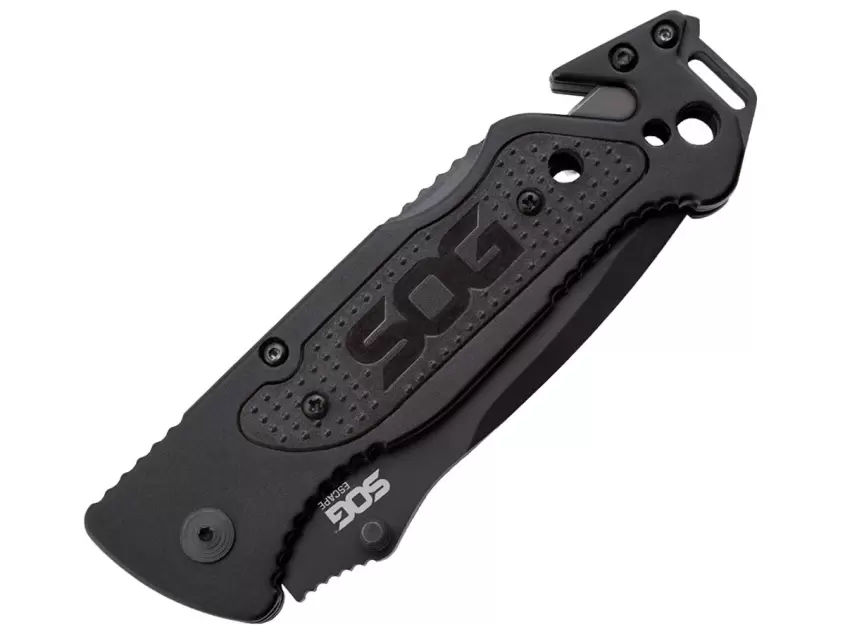 Нож складной SOG Escape Black, сталь 7Cr17MoV, рукоять алюминийНож складной SOG Escape Black — универсальный инструмент для ежедневного ношения, сочетающий в себе надёжность и многофункциональность, необходимую для решения самых разных задач.Клинок из стали 7Cr17MoV обеспечивает отличные режущие свойства и устойчивость к коррозии, что делает его долговечным и простым в уходе. Комбинированная заточка с гладким и серрейторным участком позволяет эффективно работать с мягкими и твёрдыми материалами, будь то верёвка, ткань или ремень.Рукоять из анодированного алюминиевого сплава 6061-T6 делает нож лёгким и прочным, с высокой стойкостью к коррозии. Она оснащена стеклобоем и встроенным лезвием для быстрой резки шнура или ремней безопасности, а также патентованной функцией для зачистки проводов. Клипса с глубокой посадкой и темлячное отверстие добавляют удобства при повседневном использовании.Надёжный замок Lockback обеспечивает безопасность, предотвращая случайное складывание лезвия в процессе работы. Одноручное открытие возможно благодаря шпеньку на клинке.Нож поставляется в блистере.Характеристики SOG Escape Black:Общая длина: 208 ммДлина клинка: 86 ммТолщина клинка: 3 ммТип замка: LockbackМатериал клинка: Сталь 7Cr17MoVМатериал рукояти: Алюминий 6061-T6Масса: 136 г