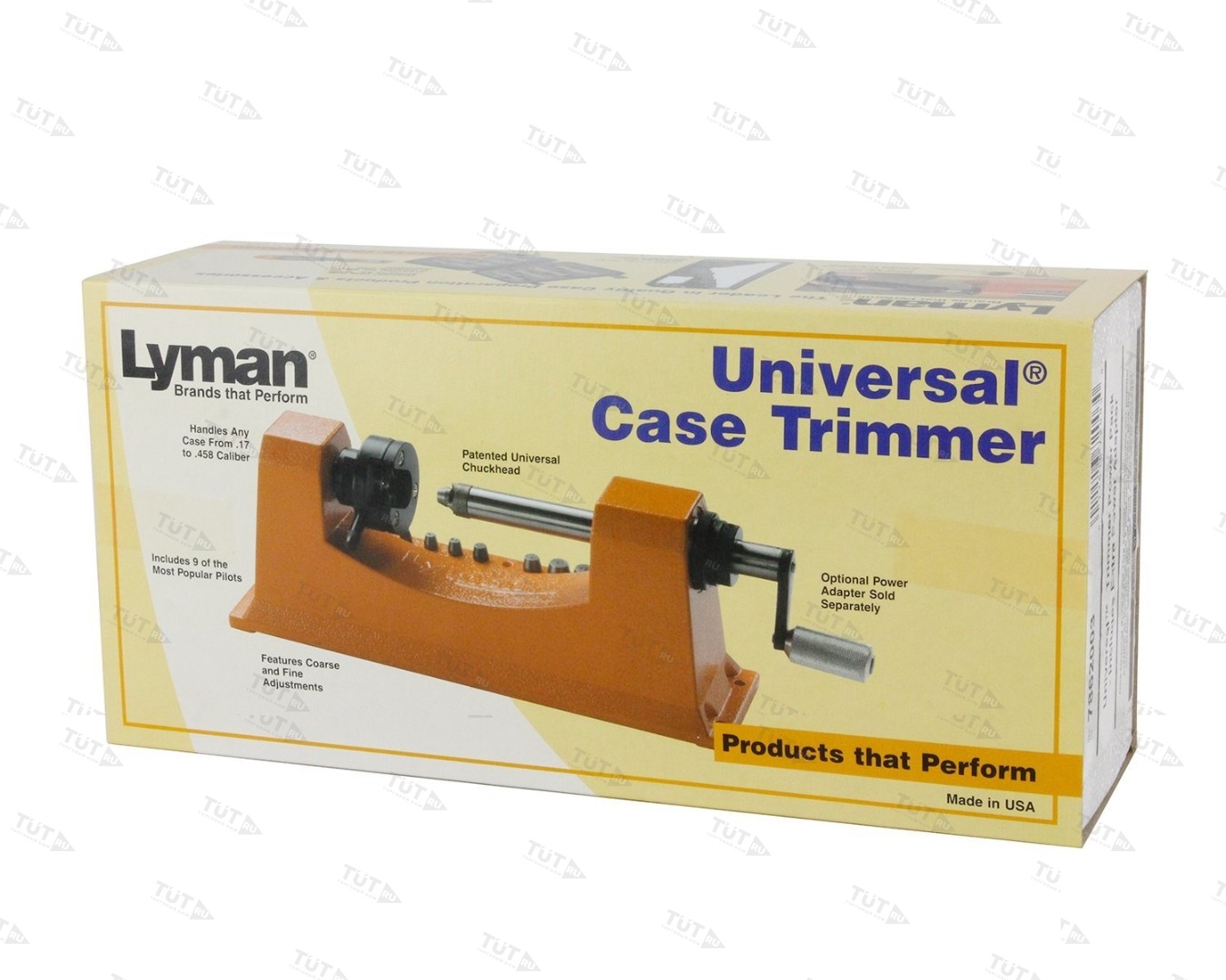 Универсальный триммер от Lyman под все калибры имеет неподвижный резак с титан-нитридным напылением, грубую и тонкую настройку резки, цанговый универсальный зажим донца гильзы и набор из 9 насадок (пилотов) под основные калибры: