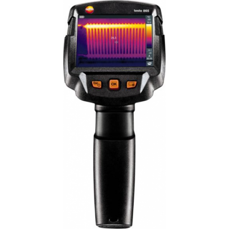 Ручной тепловизор Testo 865 – прибор начального уровня. В комплекте имеется фирменное ПО для формирования отчетов. Полученные термограммы можно сохранить и передать на ПК в формате JPEG для последующего анализа и составления отчетности в фирменном приложении Testo IrSoft. Прибор оснащен встроенной памятью объемом 2,8 Гб. В качестве источника питания используется быстро заряжаемый литиево-ионный аккумулятор, которого хватит примерно на 4 часа непрерывного использования. Севший источник питания можно быстро заменить на аналогичный. Пользователи могут выбрать одну из 4 цветовых палитр отображения (железо, радуга, холодный, серый). Доступно несколько функция анализа: измерение температуры в центральной точек, определение холодной и горячей зоны, вычисление разницы температур.