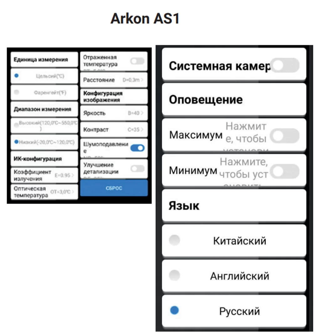 Тепловизор для смартфона Arkon AS1 позволяет изменить целый ряд параметров работы устройства. Это установка единиц измерения температуры, выбор температурного диапазона, скорость передачи данных, температурное расстояние, шумоподавление, уровень детализации и многое другое.