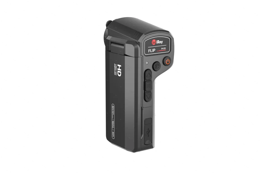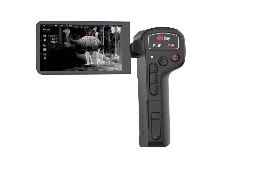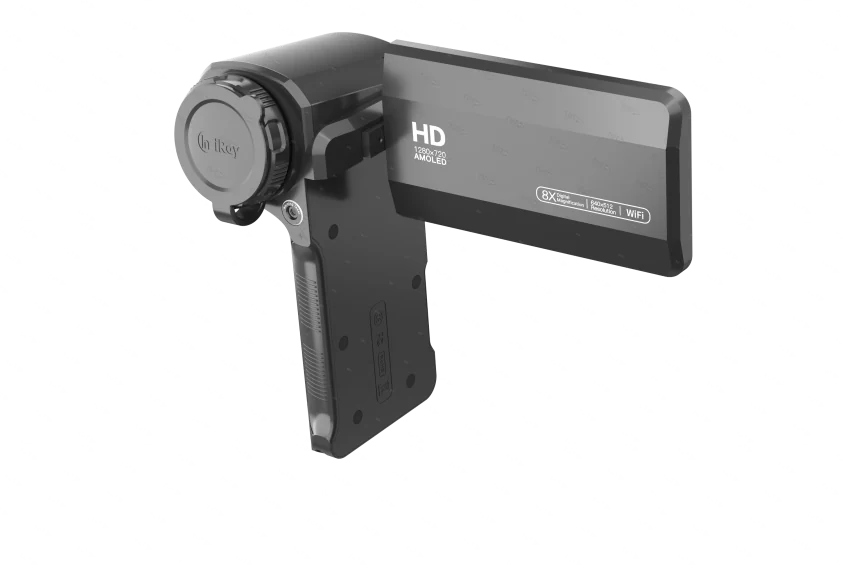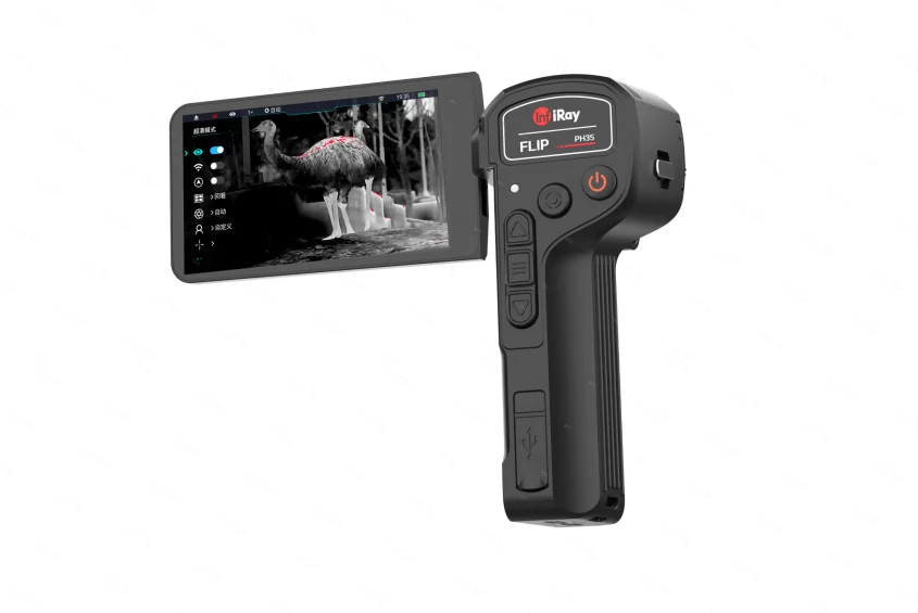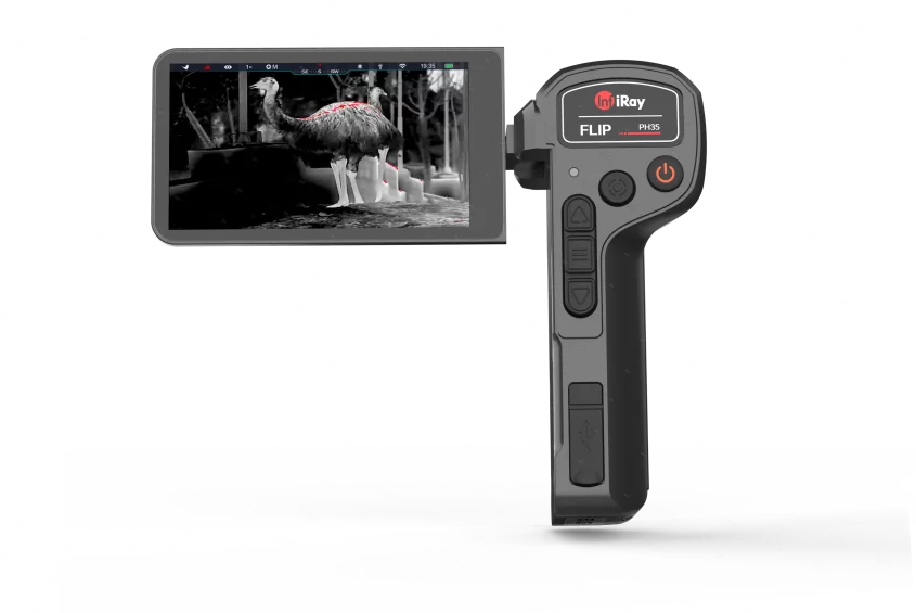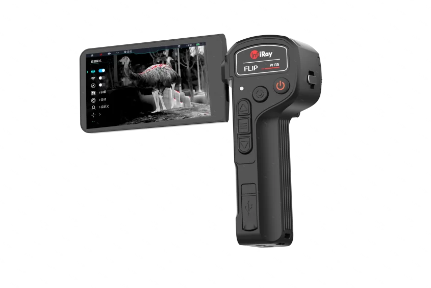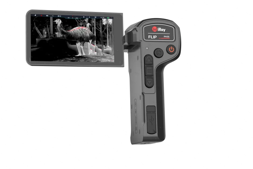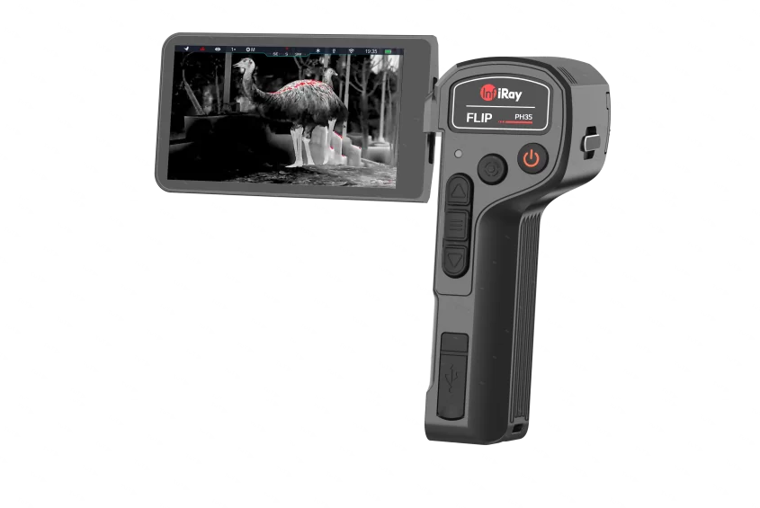 Ручной тепловизор с большим поворотным AMOLED-экраном. Сенсор 640×512 с пикселем 20 мкм и объектив 35 мм дают детализированную картинку днём и ночью. Есть запись фото и видео во встроенную память 64 ГБ, Wi-Fi и режимы улучшения изображения для плохой погоды.