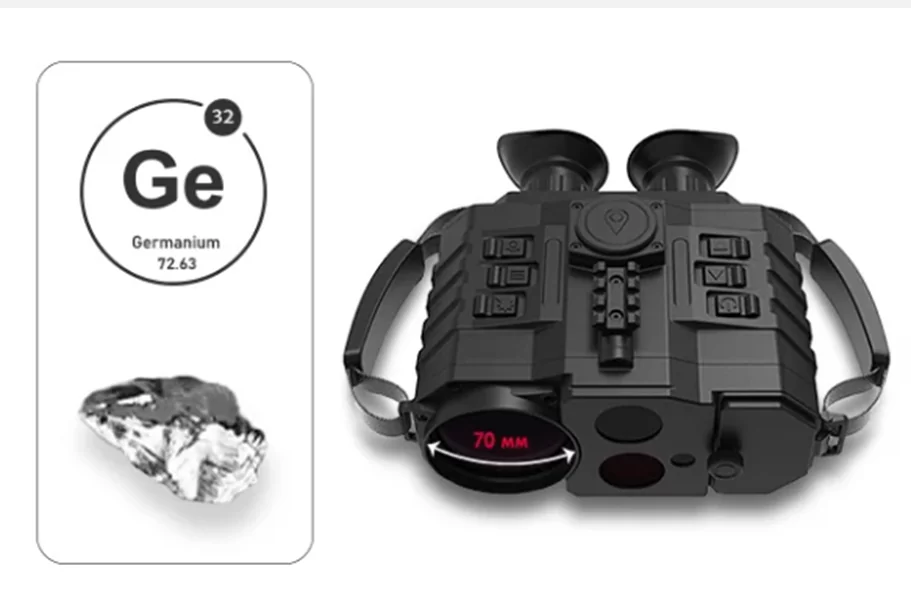 Объектив бинокля 65 мм с передней линзой из германия (32 GE) без помех пропускает ИК-излучение в требуемом для обнаружения диапазоне. Приблизить картинку можно при помощи цифрового зума с шагом х1, х2, х4. Угол поля зрения FOV (Field of view) 11,7° - 8,8° предоставляет для видимости область пространства размером 205 на 154 метров при минимальном увеличении на удалении в один километр.