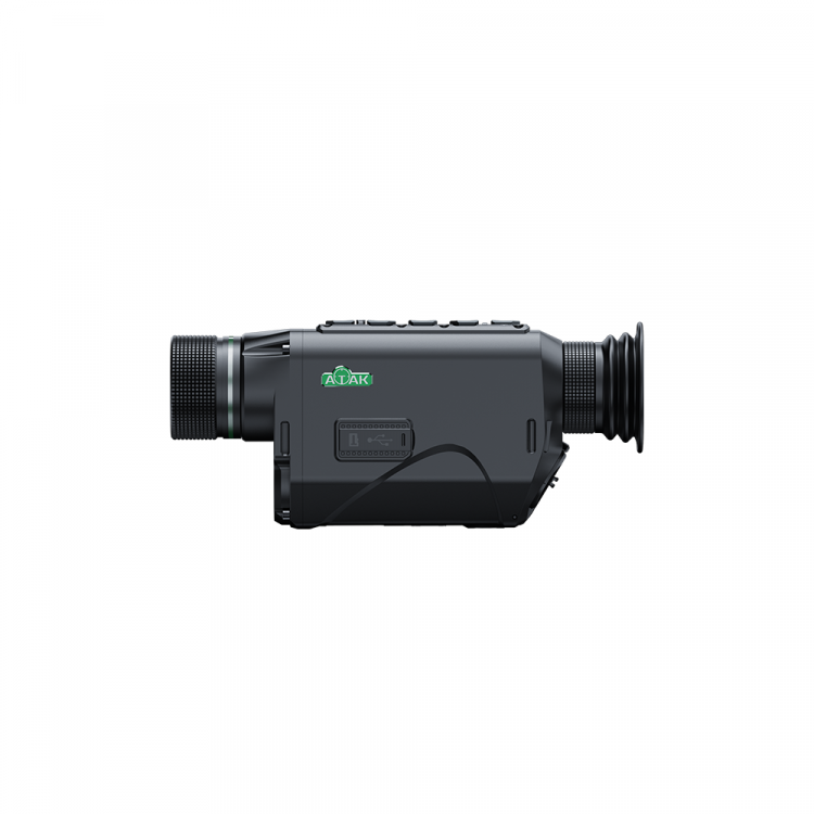 ATAK HT13-35LRF — тепловизионный монокуляр для наблюдений и измерений на средних и дальних дистанциях. В основе — сенсор VOx 384×288 с шагом 12 мкм и чувствительностью NETD < 25 мК. Объектив F35 мм, базовое увеличение 3,9×, цифровой зум ×2/×4/×8 до 31,2×. Лазерный дальномер измеряет дистанцию до 1000 м в сканирующем режиме. Дисплей AMOLED 1024×768 даёт плавную картинку и глубокий чёрный. Корпус защищён по IP67, питание — от аккумулятора 18650 до 6 часов. Фото и видео со звуком записываются на карту microSD, передача возможна по Wi-Fi и HDMI.