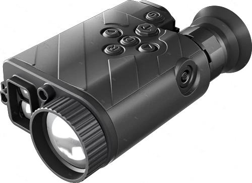 Корпус тепловизора выполнен из прочного полиамида. Влагозащитная конструкция позволяет использовать оптику в условии высокой влажности, а также под небольшими атмосферными осадками. Диапазон рабочих температур составляет от -30 до +50°С. В нижней части корпуса расположено гнездо для штативного адаптера. Прорезиненное покрытие корпуса обеспечивает надежный хват даже полностью мокрыми руками.