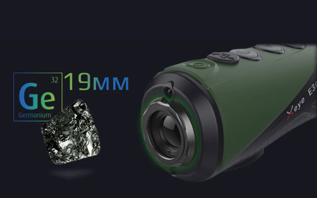 Тепловизионный монокуляр iRay xEye E3W оснащен германиевым объективом с фокусным расстояниям 19 мм. Показатель угла пространственного зрения FOV (Field of view) - 19,5° - 14,7° один из самых больших среди приборов всей серии. На удалении в сто метров пользователи могут видеть область пространства размером 34,4 на 25,8 метров. Германиевая передняя линза полностью прозрачна в ИК-диапазоне, позволяя тепловизору беспрепятственно видеть как в темноте, так и при атмосферных преградах в виде тумана, дыма, осадков. Базовое увеличение 2х, при помощи функции Digital zoom можно получить кратность х4.