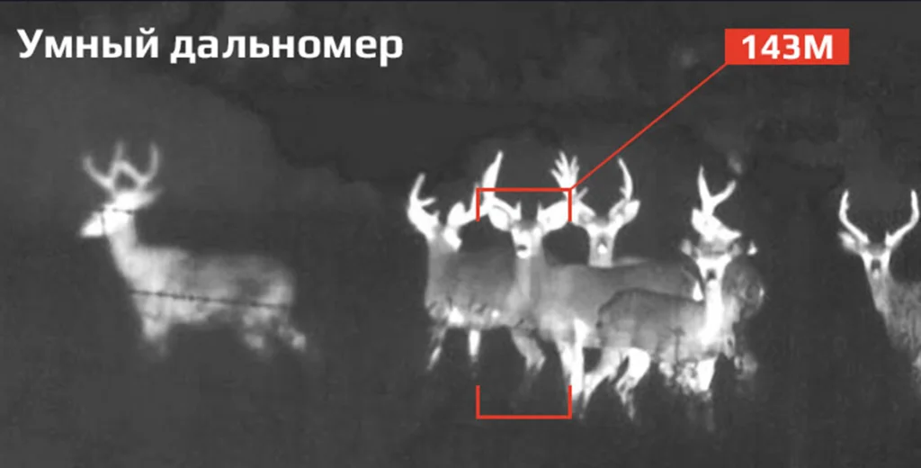 В тепловизоре монокуляр IRay xEye 2 E6 Plus v3 имеется интеллектуальный дальномер на три предустановленных значения, который позволяет выяснить расстояние к объекту по известным его габаритам. Все, что нужно охотнику - выбрать тип животного, отметить верхнюю и нижнюю границы. Результат измерений будет доступен в поле зрения на основном экране.