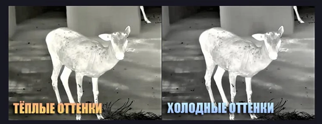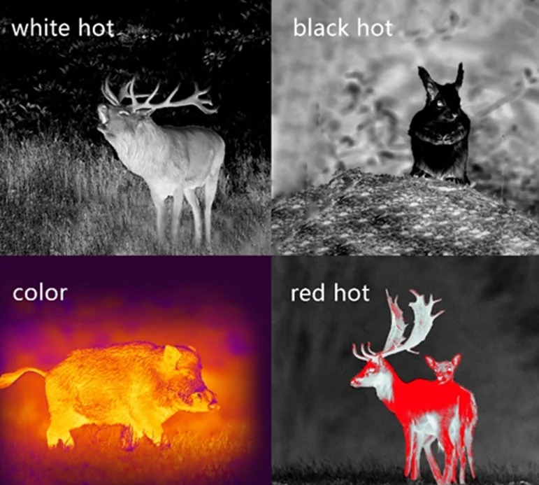 Предложенный набор цветового оформления позволят выбрать оптимальный режим для любых условий наблюдения в зависимости от дистанции и видимости самого объекта. Инверсные палитры с монохромными оттенками черного, белого цветов хорошо выделяют теплый объект на прохладном фоне. Животное будет хорошо заметно на фоне открытого поля или лесного массива. «Горячий красный» подсветит ярким цветом самые теплые места. Палитра «Color» рекомендована на небольших дистанциях при необходимости детально рассмотреть цель и точно идентифицировать объект.