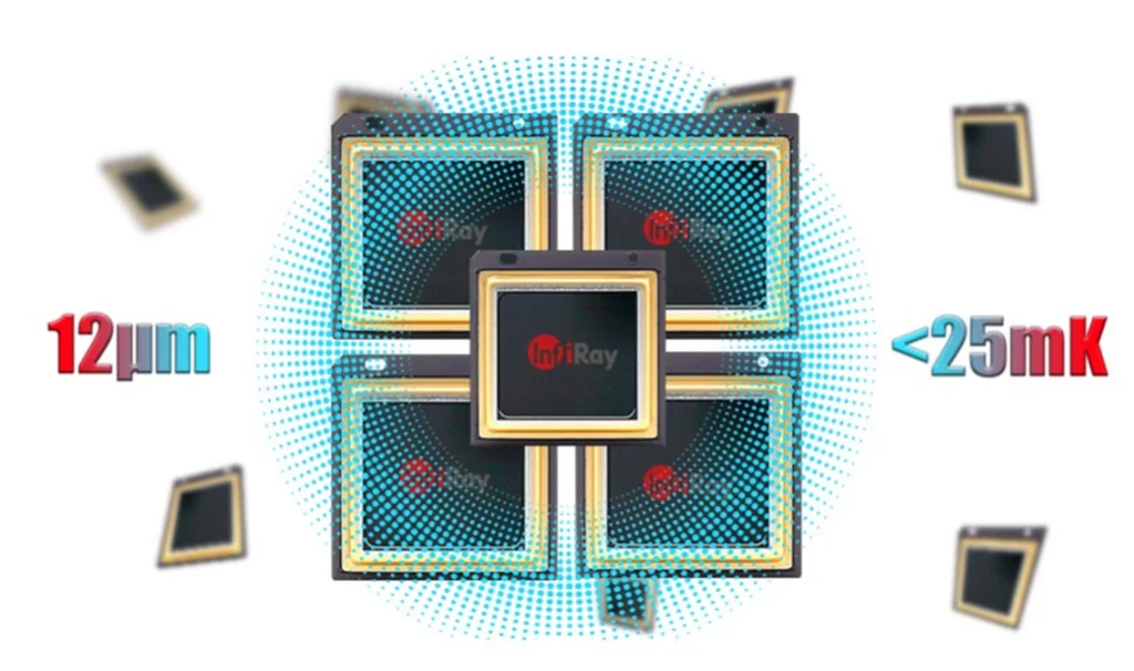 За тепловизионное видение отвечает ультрасовременный ИК-сенсор из оксида ванадия VOx 640х512, который изготовлен по технологии с плотностью посадки детекторов 12 мкм. Высокий порог температурной чувствительности (NETD) < 25 мК позволяет регистрировать минимальные температурные отклонения на поверхности наблюдаемых объектов, преобразуя сигнал в четкое и контрастное изображение даже при полной отсутствии видимости. Спектральный диапазон чувствительности (8-14 мкм) находится в длинноволновой части инфракрасного излучения LWIR, где атмосфера земли не создает помех для прохождения сигнала. Модуль работает с частотой 50 Гц, пользователям доступно четкое и непрерывное изображение движущихся с большой скоростью объектов.