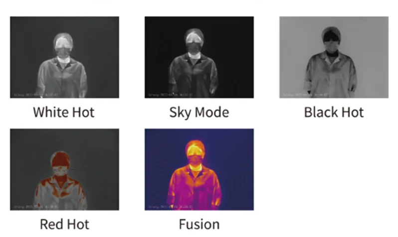 - Цветовые палитры: Black Hot, White Hot, Red Hot, Fusion, Sky