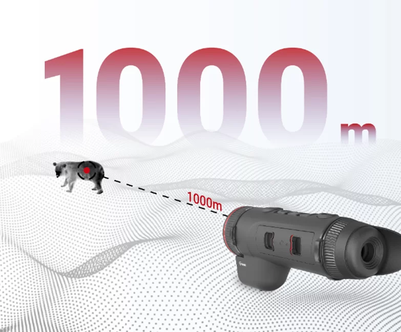 Встроенный дальномер предназначен для точного измерения расстояния на дистанциях до 1000 метров. Устройство размещено в одном оптическом канале, работает на длинах волн 905 нм и обеспечивает точность измерений с погрешностью ±1 метр. Дальномер соответствует требованиям стандартов первого класса лазерной безопасности.