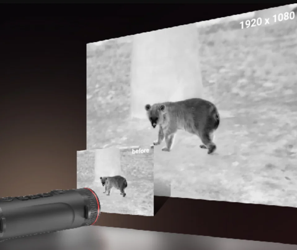 Встроенный в окуляр тепловизора AMOLED дисплей с диагональю экрана 0,39 дюйма передает изображение в Full HD качестве. Разрешение картинки 1920x1080 пикселей позволит Вам в мельчайших деталях рассмотреть любой удаленный объект. Для настройки изображения предусмотрены регулировки контраста и яркости в пределах 10 уровней. Идеально настроить изображение под индивидуальные особенности зрения можно при помощи механизма корректировки диоптрий.