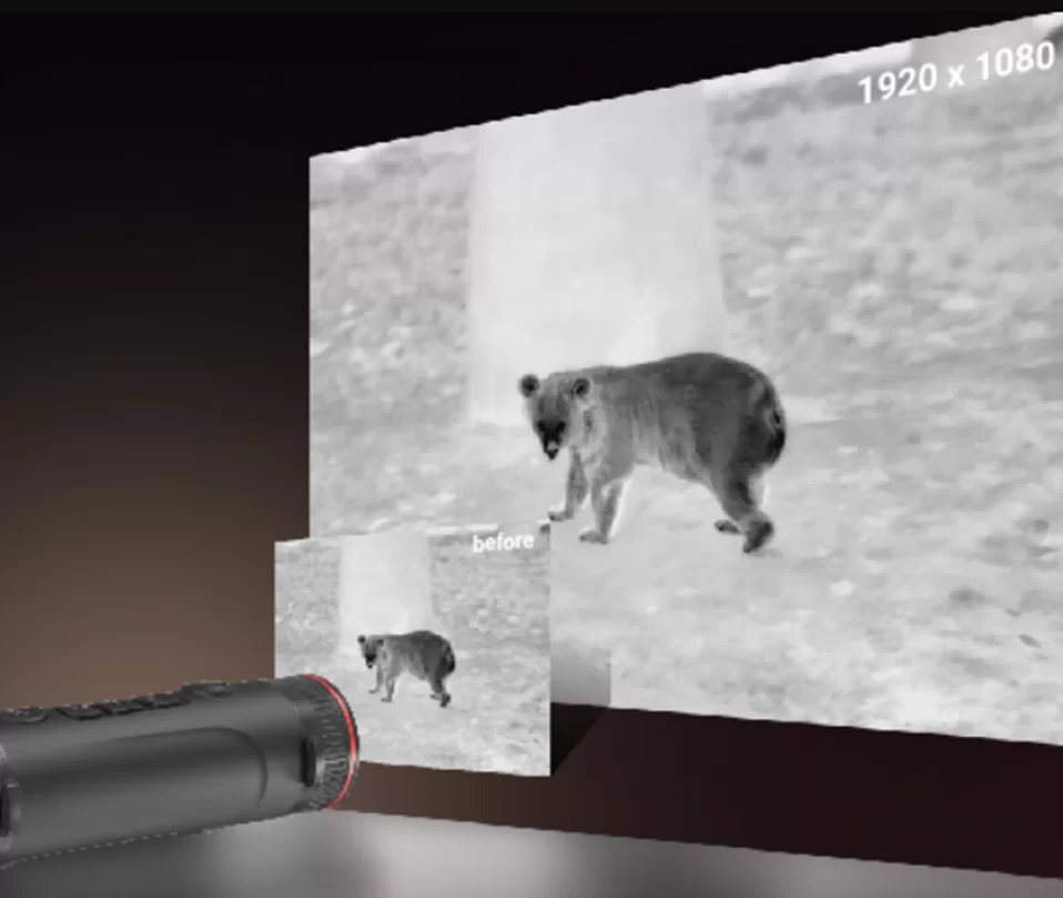 Тепловизионный модуль этой модели построен на ИК-сенсоре (Uncooled VOx Infrared Detector) с разрешением 640×512 пикселей с плотностью посадки детекторов 12 µm. Крайне низкий порог температурной чувствительности NETD < 20 mK, позволяет фиксировать минимальные колебания температуры на поверхностях наблюдаемых объектов, что положительным образом сказывается на общем уровне детализации и информативности термографического изображения. Спектральный диапазон чувствительности находится в пределах 8 - 14 µm, это длинноволновая часть инфракрасного спектра LWIR, попадающая в одно из окон прозрачности земной атмосферы. Благодаря этому тепловизионная оптика свободно видит при полном отсутствии света, а также сквозь преграды в виде тумана, дыма или осадков. Частота обновления кадров равна 50 Гц.