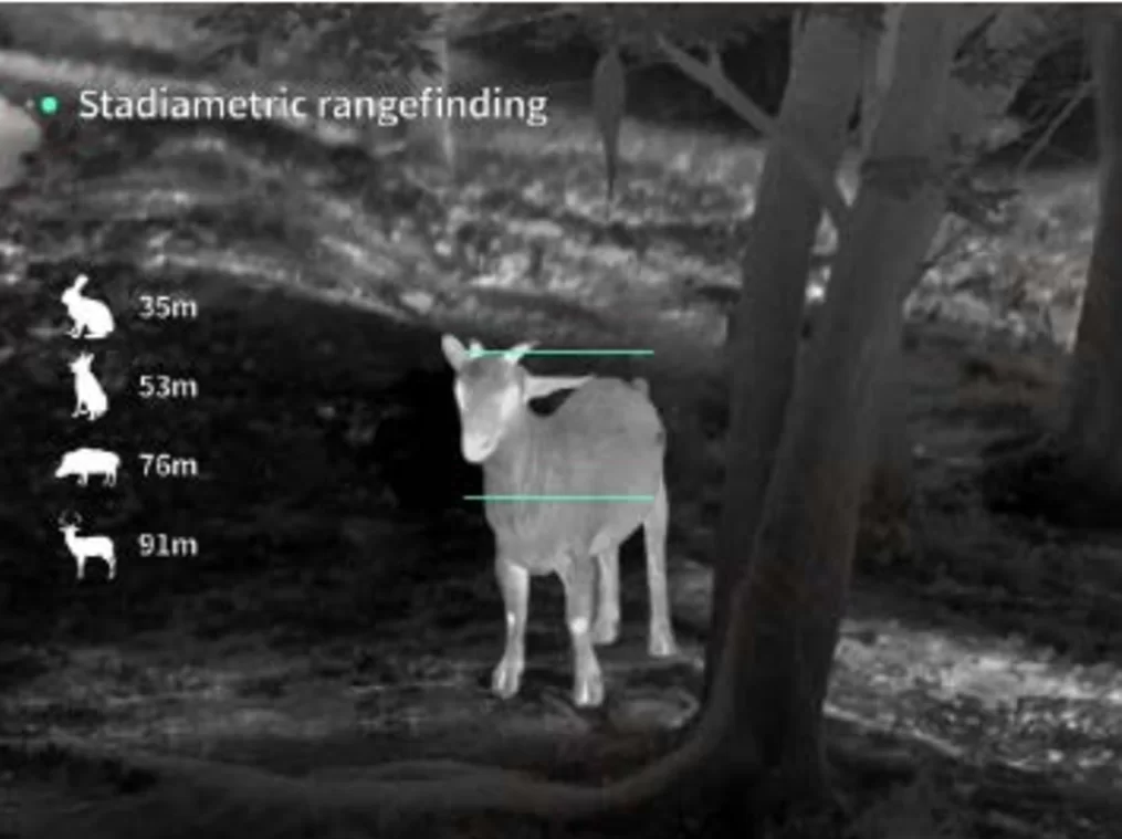 Реализованная программным путем функция дальномера позволяет узнать расстояние до объекта по его габариту. В памяти имеется четыре предустановленных значения, соответствующие определенным животным. Выберите тип цели, отметьте его верхнюю и нижнюю границы, и прибор автоматически выдаст результат. Вычисленное расстояние до объекта появится в поле зрения на дисплее прибора.