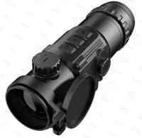 Объектив, обладающий фокусным расстоянием 50 мм, имеет базовую кратность 1х, которая не искажает реальные размеры объектов. Цифровой зум позволит увеличить изображение от х1 до 4х, этот параметр рекомендован для использования при работе в режиме монокуляра. Ключевым показателем является угол пространственного поля зрения FOV, который составляет 8,8° - 7°. Если перевести это значение в линейные величины, то получим область пространства размером от 154 до 122 метров на расстоянии в 1000 метров. Насадка не создает туннельного эффекта, что существенно повышает комфорт использования. Регулировка фокусировки на конкретную дистанцию осуществляется вручную при помощи небольшой турели на объективе.