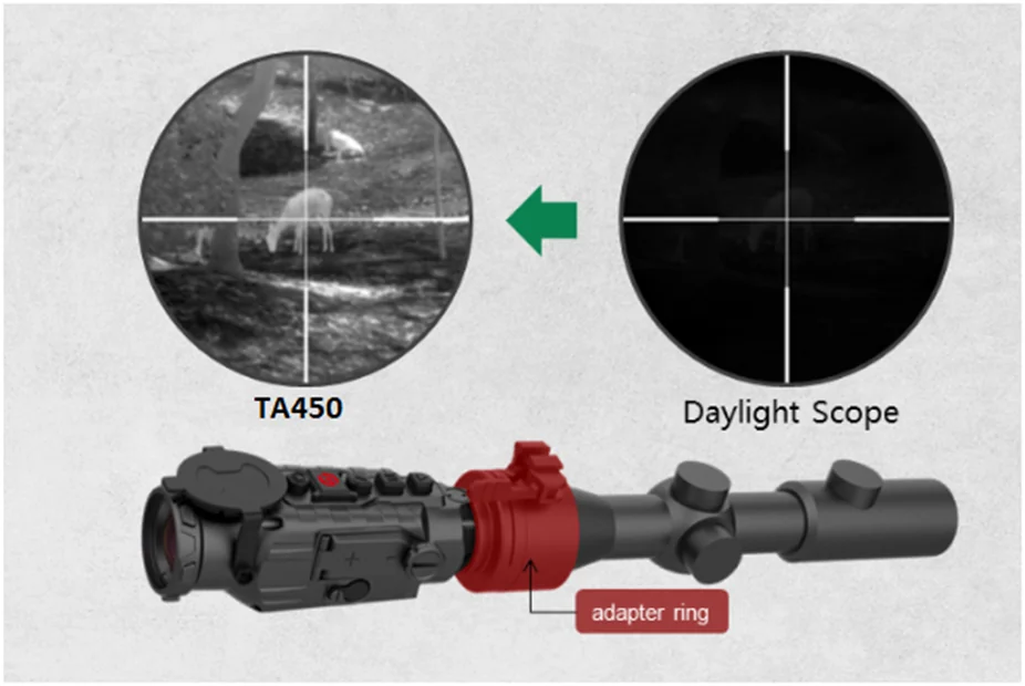 Guide TA450 крепится на объектив оптического прицела при помощи специального цилиндрического адаптера, который совместим с несколькими диаметрами: от 40 до 70 мм. Надежная клипсообразная система гарантирует устойчивое положение насадки даже при интенсивных ударных нагрузках. Конструкция обеспечивает центрированное положение осей тепловизионной насадки и дневной оптики, исключаяя необходимость в повторной пристрелке прицела.