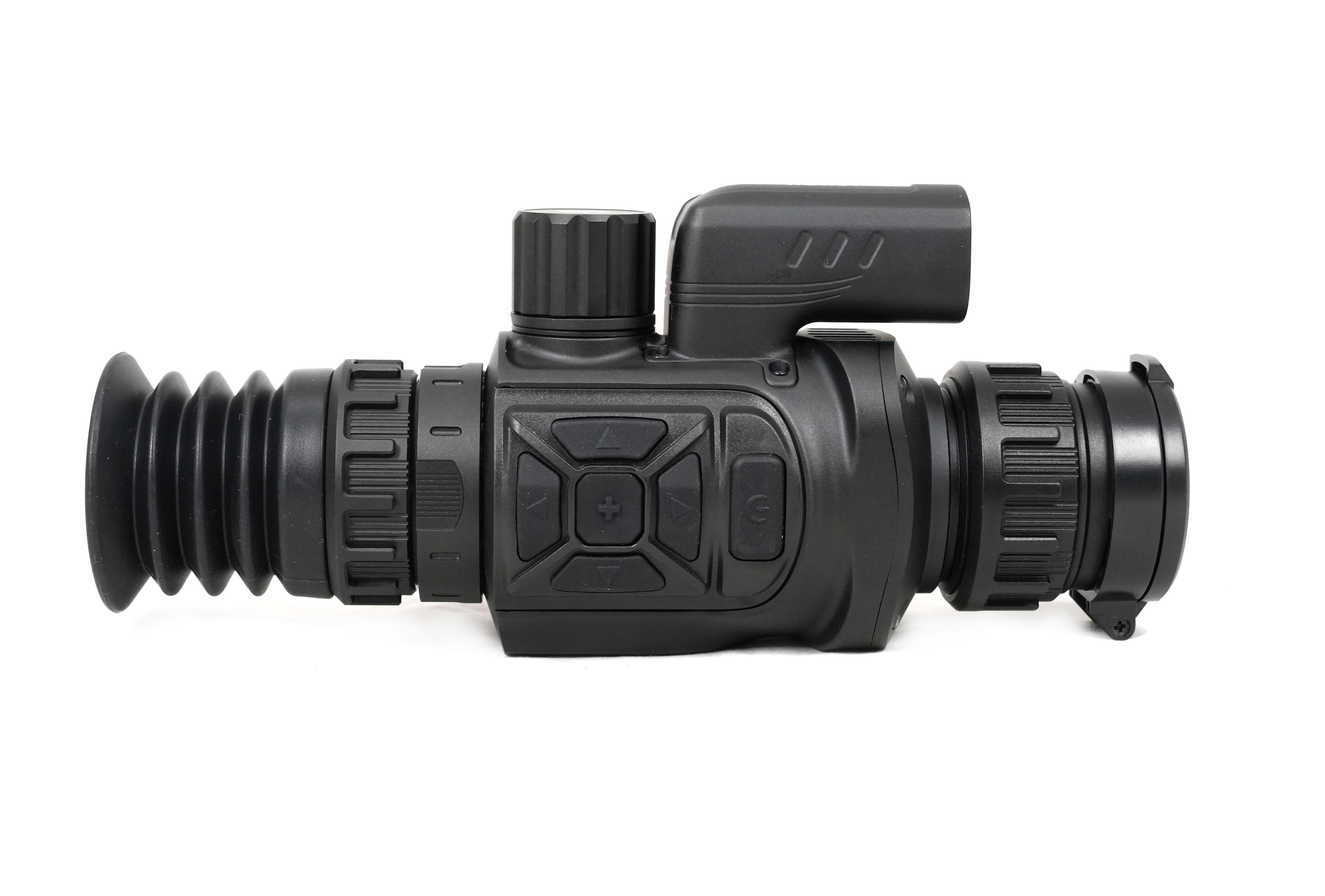 Германиевый объектив с фокусным расстоянием 35 мм и апертурой F1.0 обладает наибольшим во всей линейке прицелов показателем угла пространственного поля зрения FOV 12.5°x10°. В линейных размерах стрелок будет видеть перед собой сектор пространства размером 21,9 - 17,5 м на удалении в сто метров. Начальный уровень увеличения составляет 1,6х, для масштабирования изображения доступна функция Digital zoom, позволяющая плавно или дискретно изменять кратность в пределах от 1х до 8х. Наведение резкости изображения выполняется вручную, путем поворота низкопрофильного кольца на объективе.