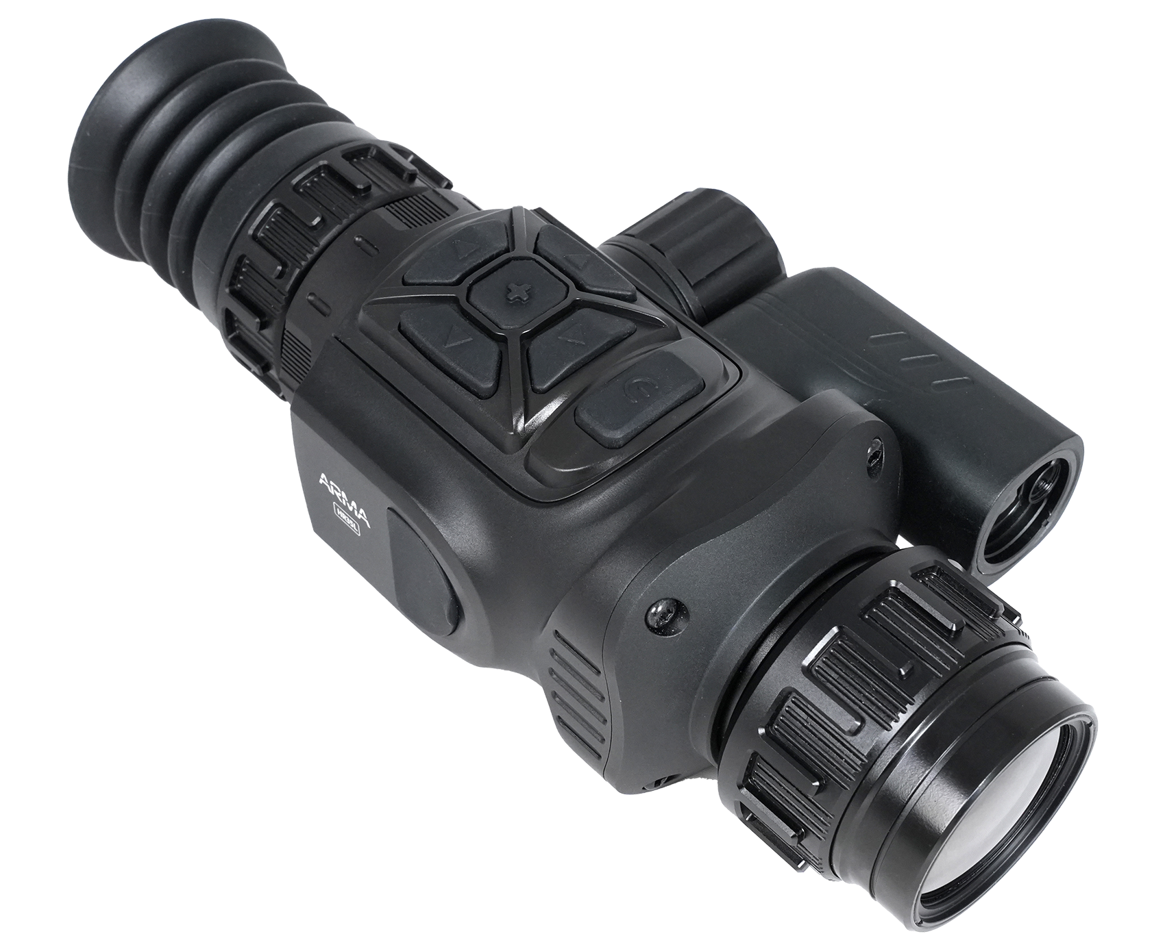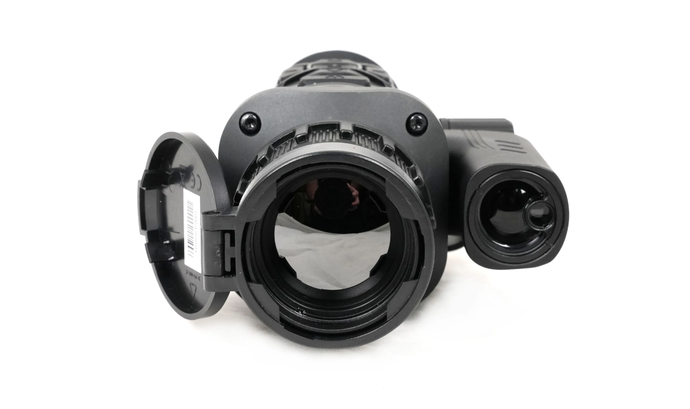 Тепловизионный прицел оснащен лазерным дальномером, способным оперативно измерять расстояния в диапазоне от 10 до 1200 метров. Излучатель и приемник находятся в одном оптическом канале, а само устройство удачно вписано в общий концепт конструкции и не мешает обзору. Дальномер работает на длинах волн 905 нм и отвечает требованиям первого класса лазерной безопасности. Погрешность измерений составляет ±1 м. Доступно 2 режима работы: одиночное измерение и режим непрерывного сканирования.