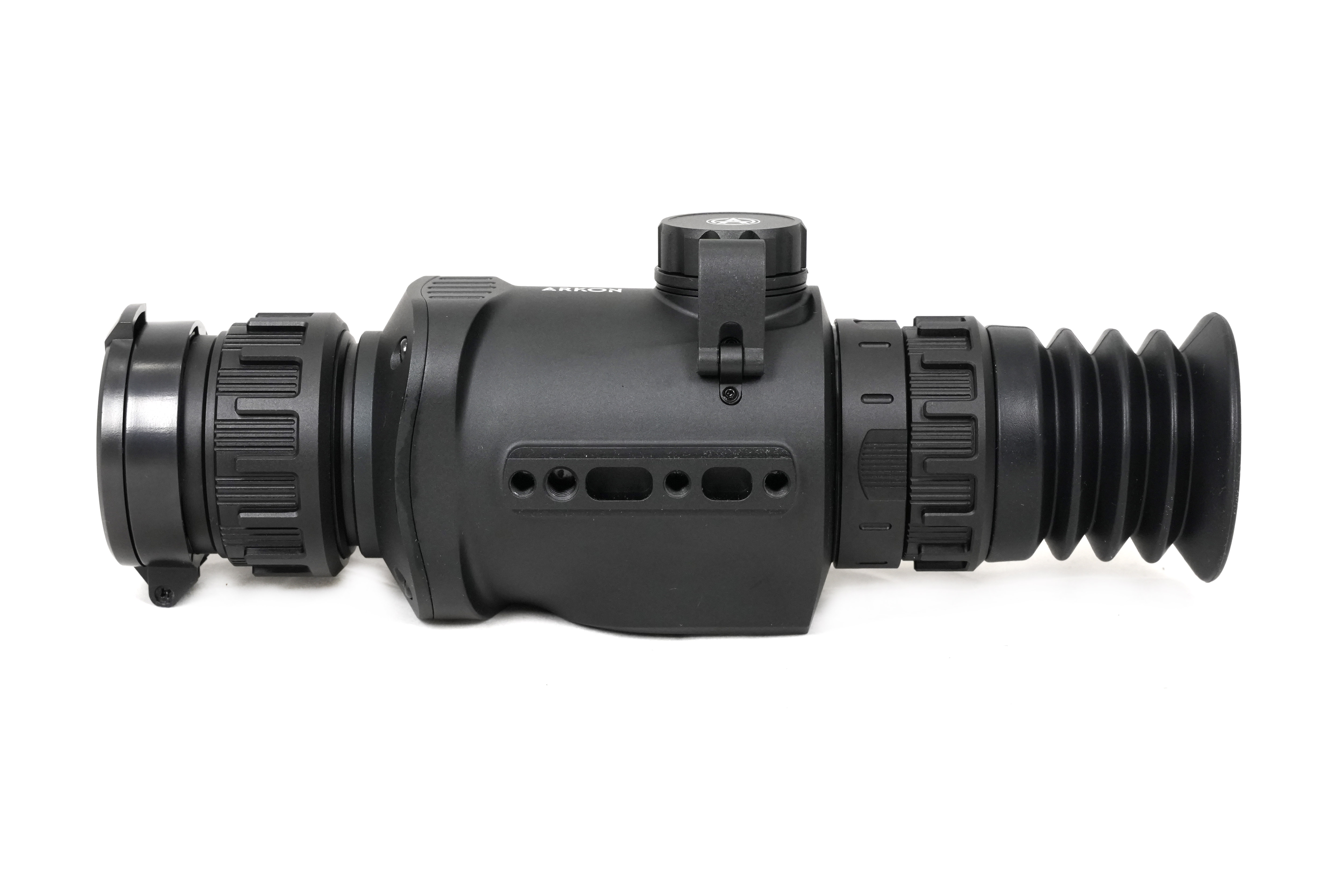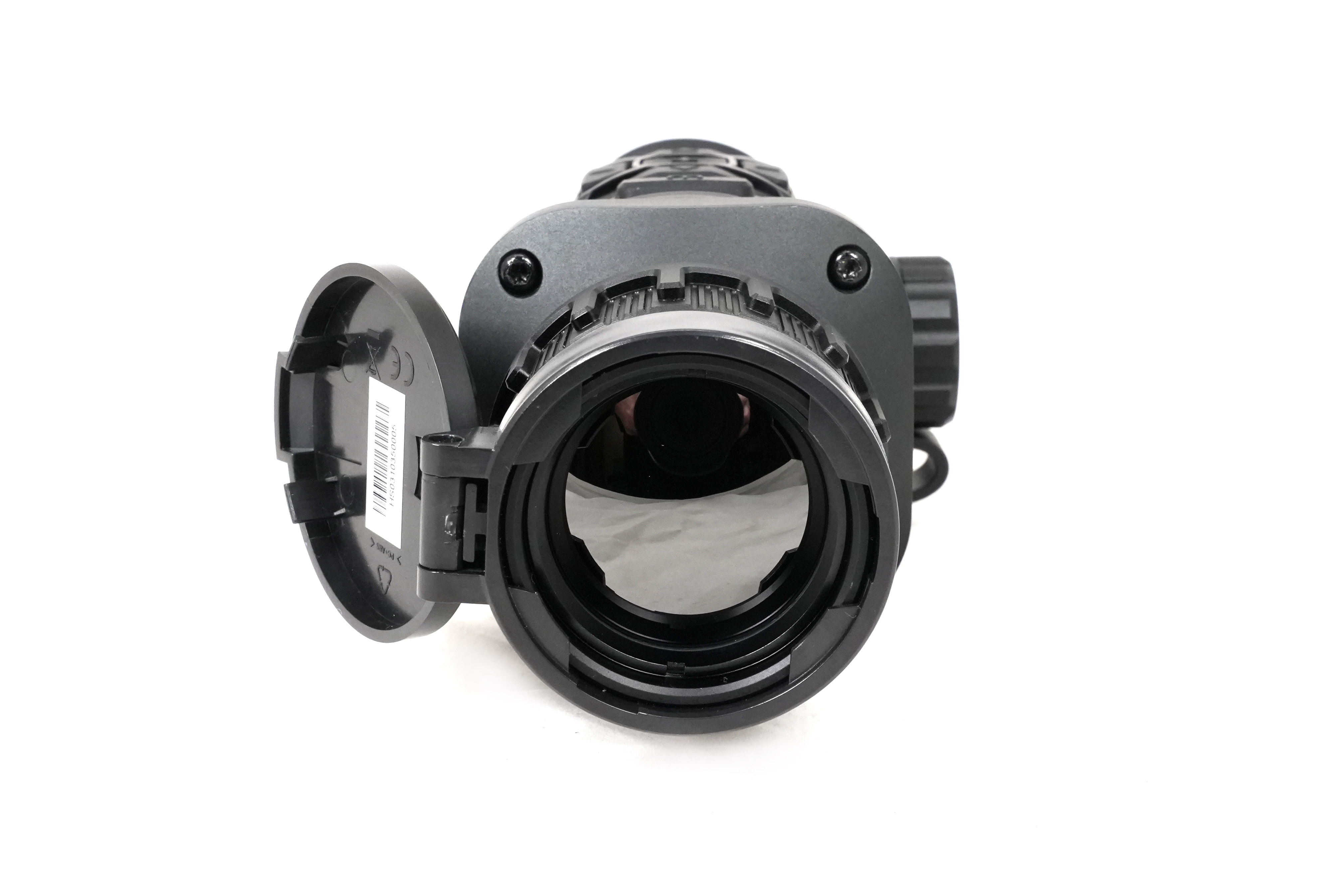 Этот прицел оснащен германиевым объективом с фокусным расстоянием 35 мм и апертурой F1.0, что обеспечивает высокое качество изображения. Настройка резкости на различных дистанциях осуществляется при помощи низкопрофильного кольца на объективе. Базовая оптическая кратность составляет 3,1х, а функция Digital zoom позволяет изменять масштаб в диапазоне от 1х до 8х, что позволяет достичь максимального увеличения в 24,8х. Угол поля зрения при минимальном увеличении равен 7,5° х 5,7°, предоставляя для видимости область пространства размером 13,1 на 10 метров на удалении в 100 метров.