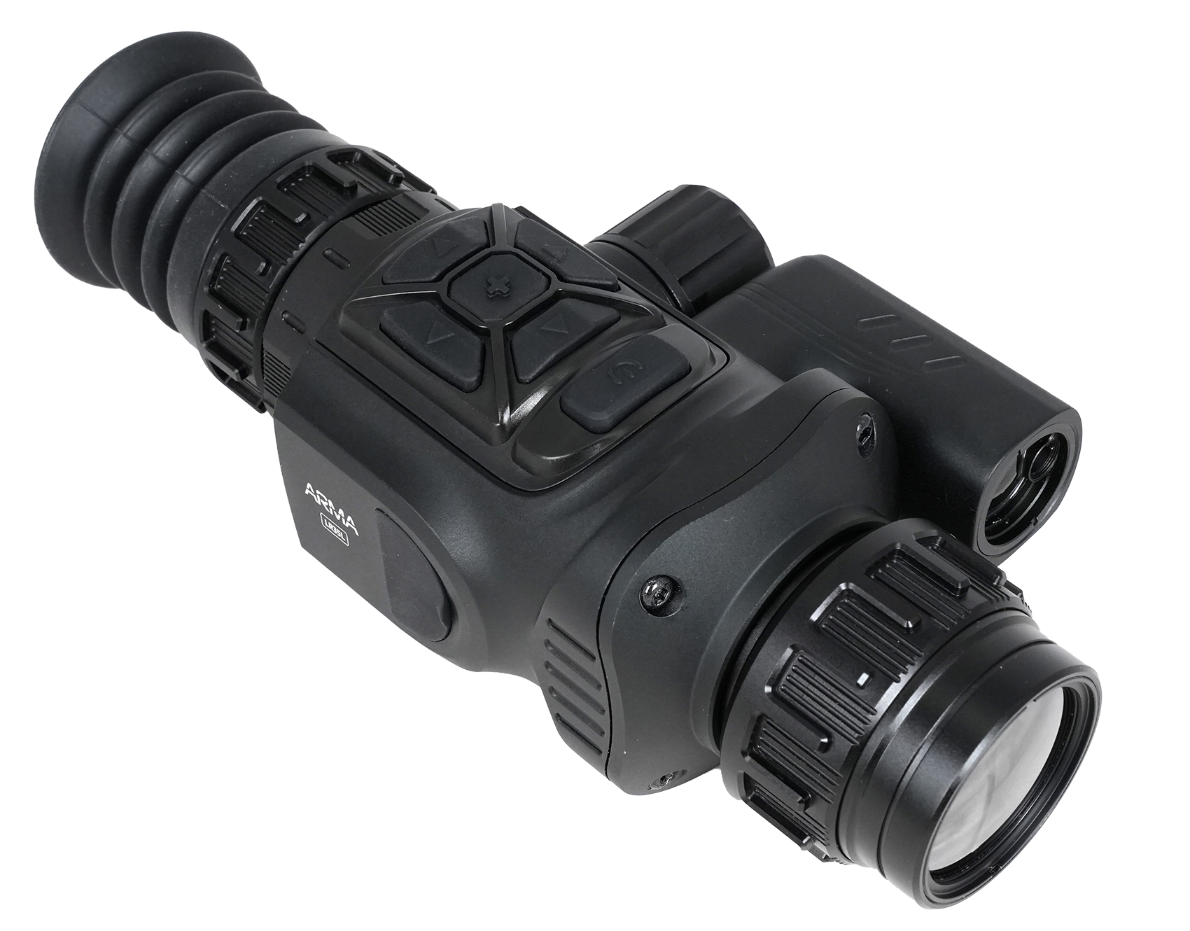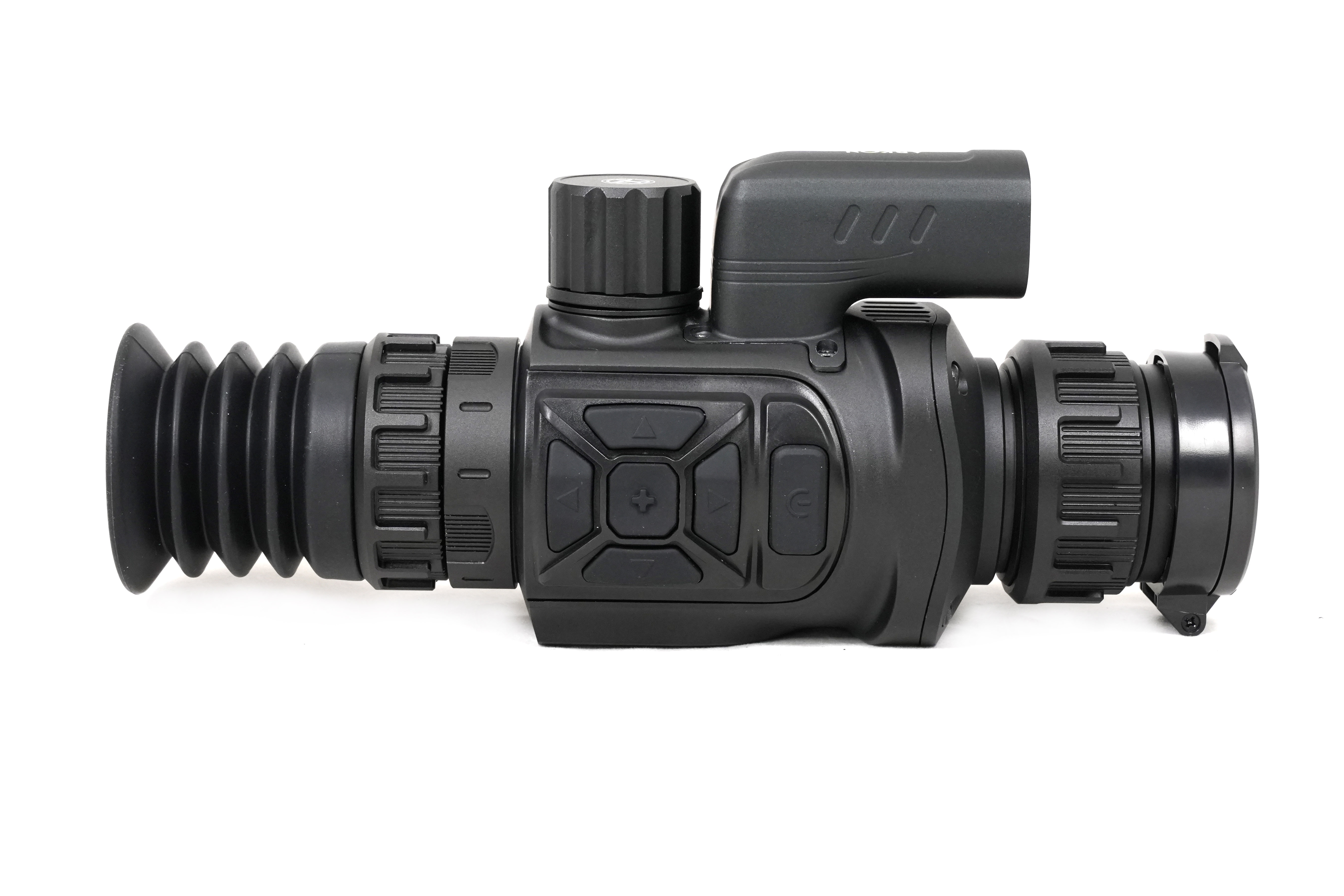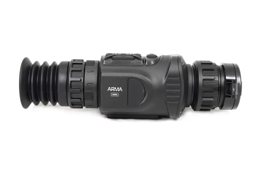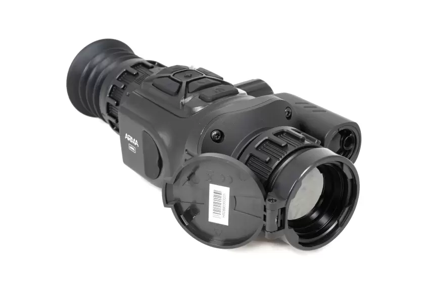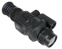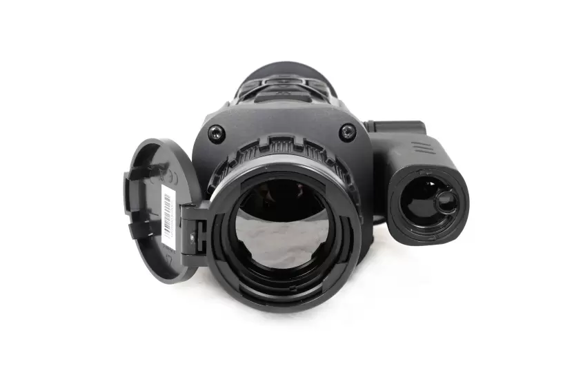 Прицел оснащен германиевым объективом с фокусным расстоянием 35 мм и апертурой F1.0. Настройка резкости на необходимую дистанцию выполняется с помощью низкопрофильного кольца на объективе. Начальный уровень увеличения составляет 3,1х. Для увеличения изображения доступна функция Digital zoom, позволяющая плавно или дискретно изменять кратность от 1х до 8х, достигая максимального значения 24,8х. При минимальном увеличении угол поля зрения (FOV) составляет 7,5° х 5,7°, что соответствует видимой области пространства размером 13,1 на 10 метров на удалении 100 метров.