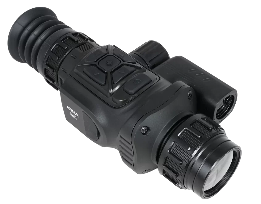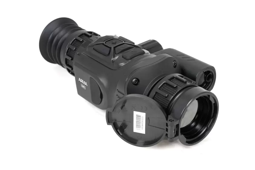 Тепловизионный прицел оснащен лазерным дальномером, способным оперативно измерять расстояния в диапазоне от 10 до 1200 метров. Излучатель и приемник находятся в одном оптическом канале, а само устройство удачно вписано в общий концепт конструкции и не мешает обзору. Дальномер работает на длинах волн 905 нм и отвечает требованиям первого класса лазерной безопасности. Погрешность измерений составляет ±1 м. Доступно 2 режима работы: одиночное измерение и режим непрерывного сканирования.